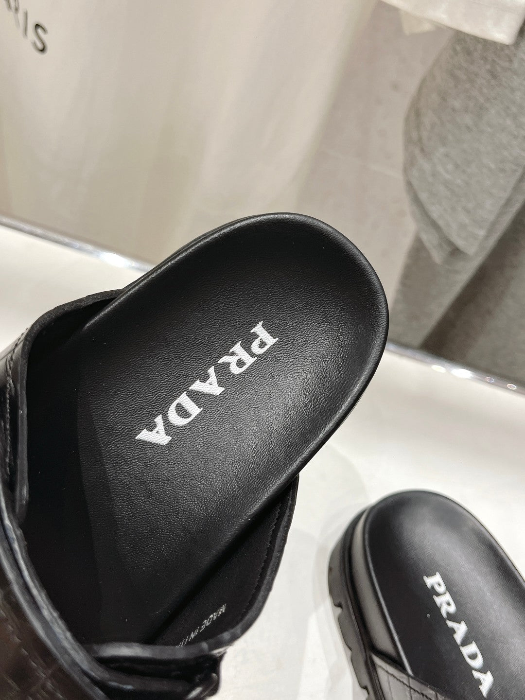 PRA CROCODILE MOTIF STRAP SLIDES SANDALS BLACK CALFSKIN