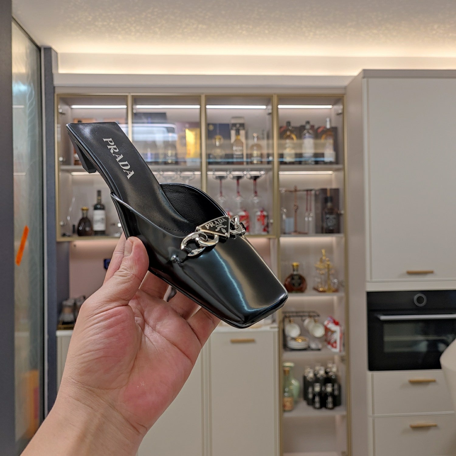 PRA SQUARE TOE MULES BLACK CALFSKIN WITH CHAIN