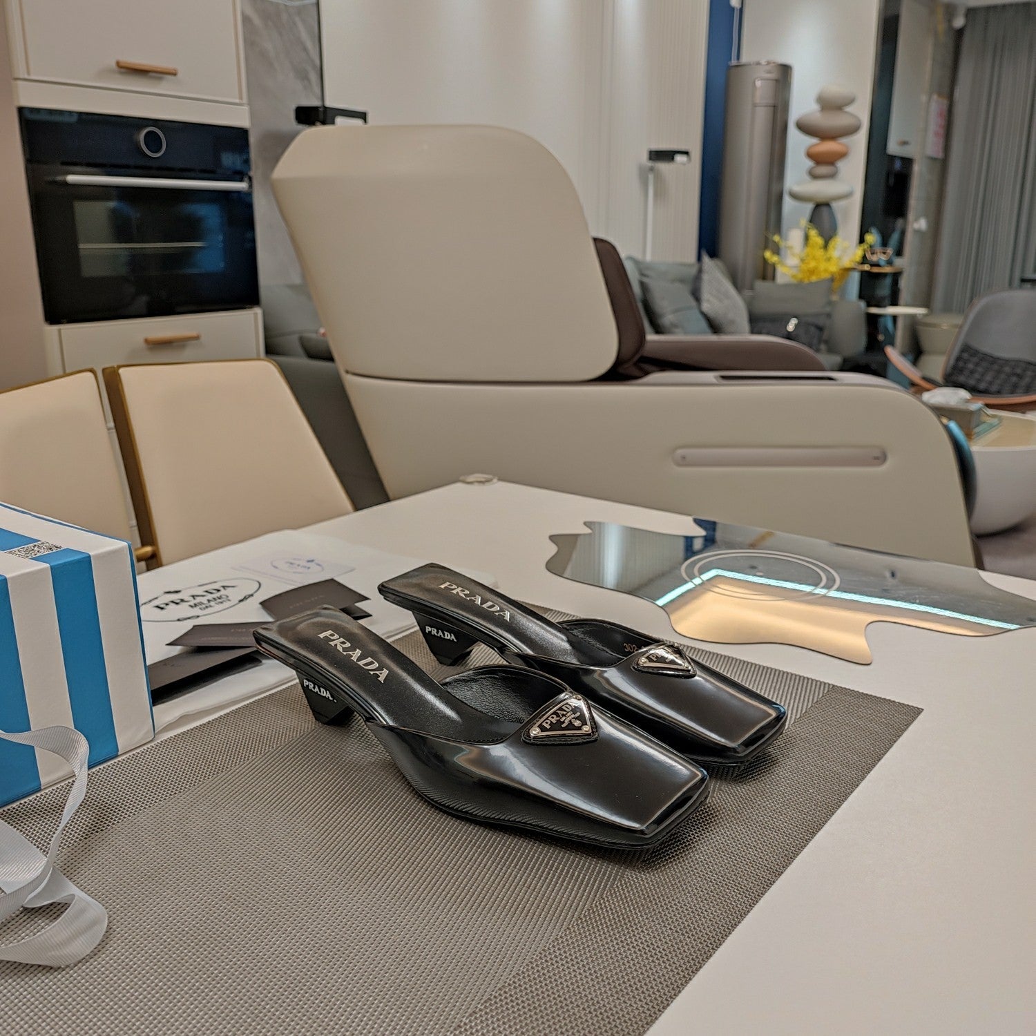 PRA SQUARE TOE MULES BLACK CALFSKIN WITH LOGO