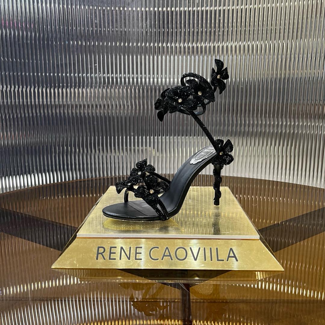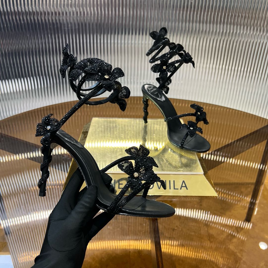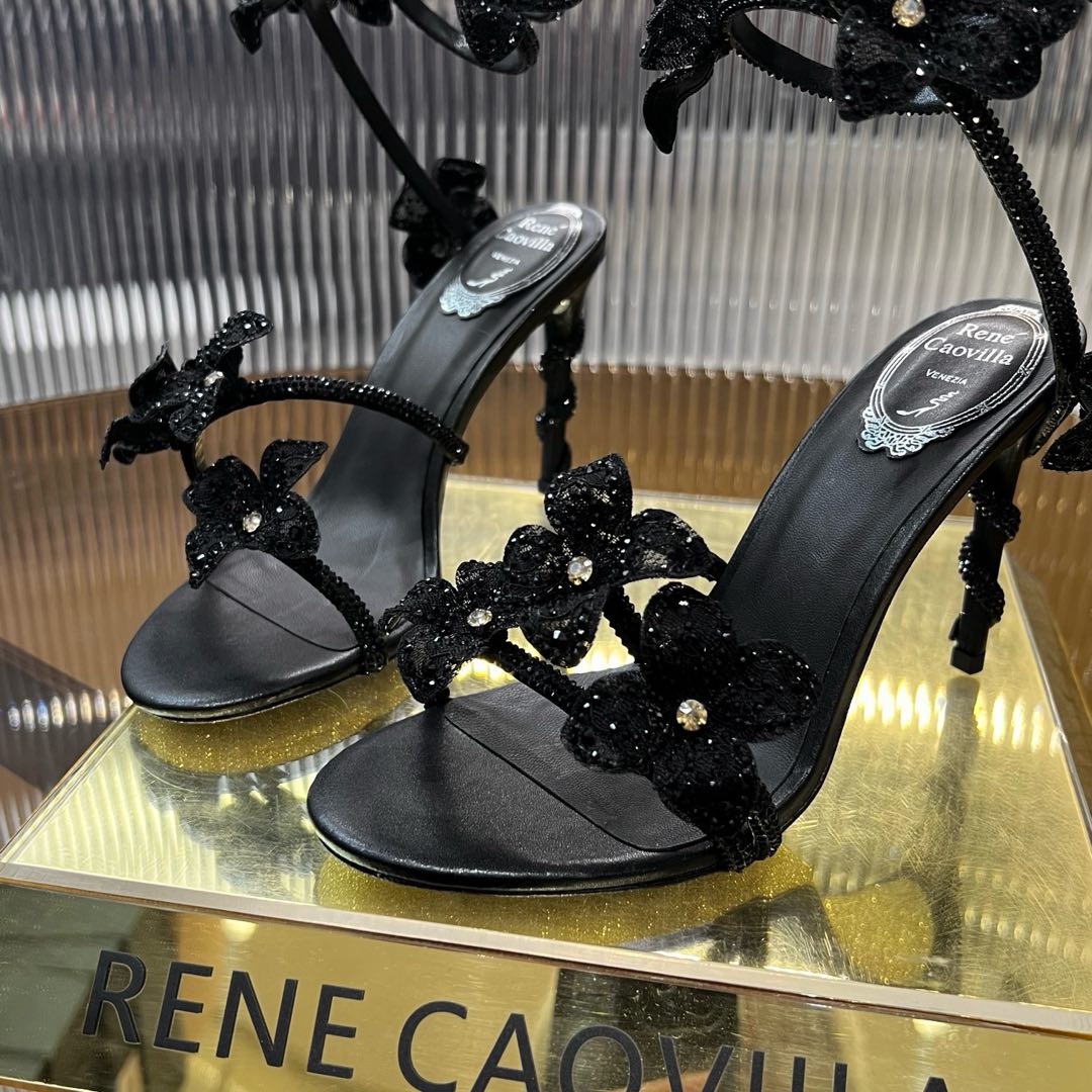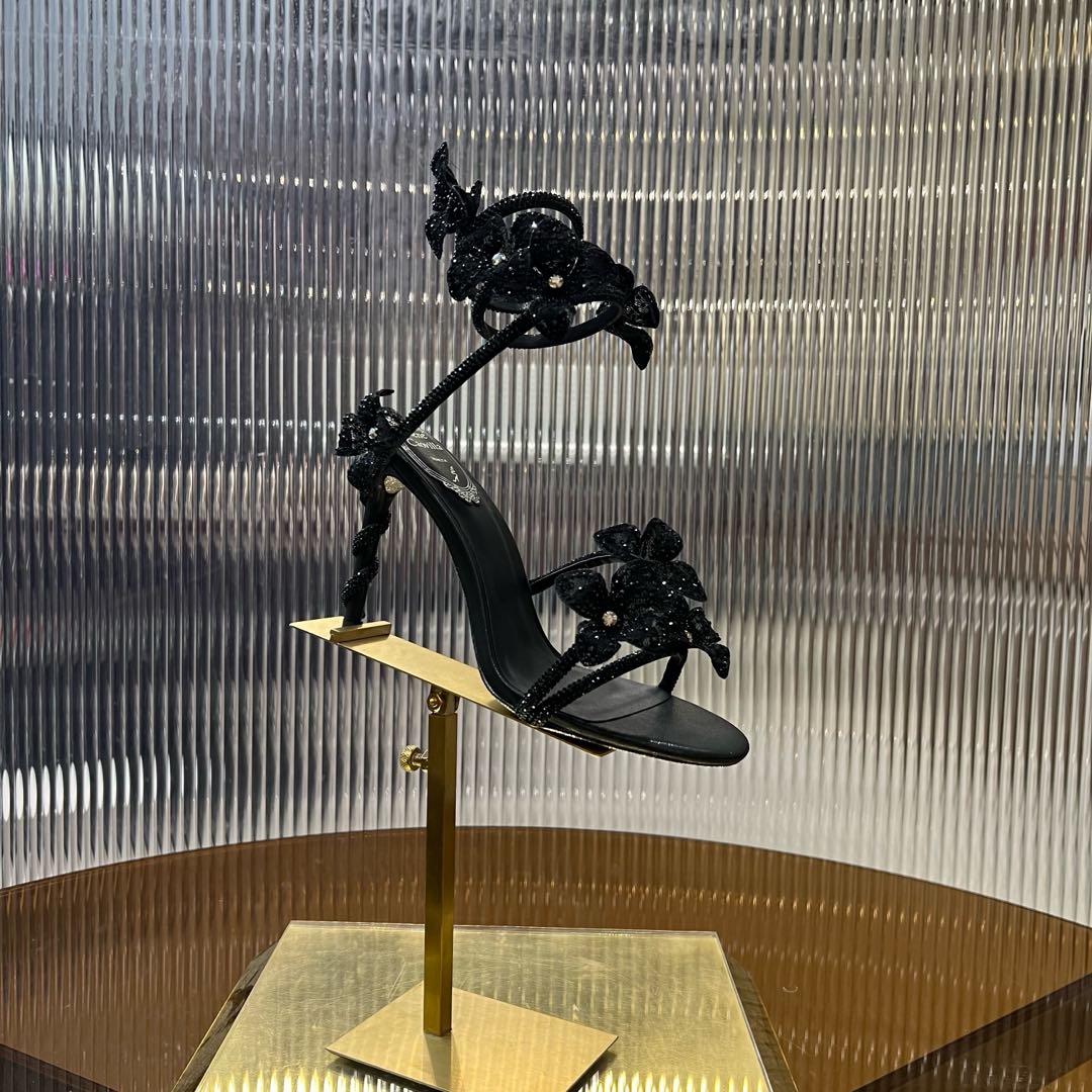 RC 25C Flower-Studded Diamond High-Heeled Sandals Black Sheepskin 174909