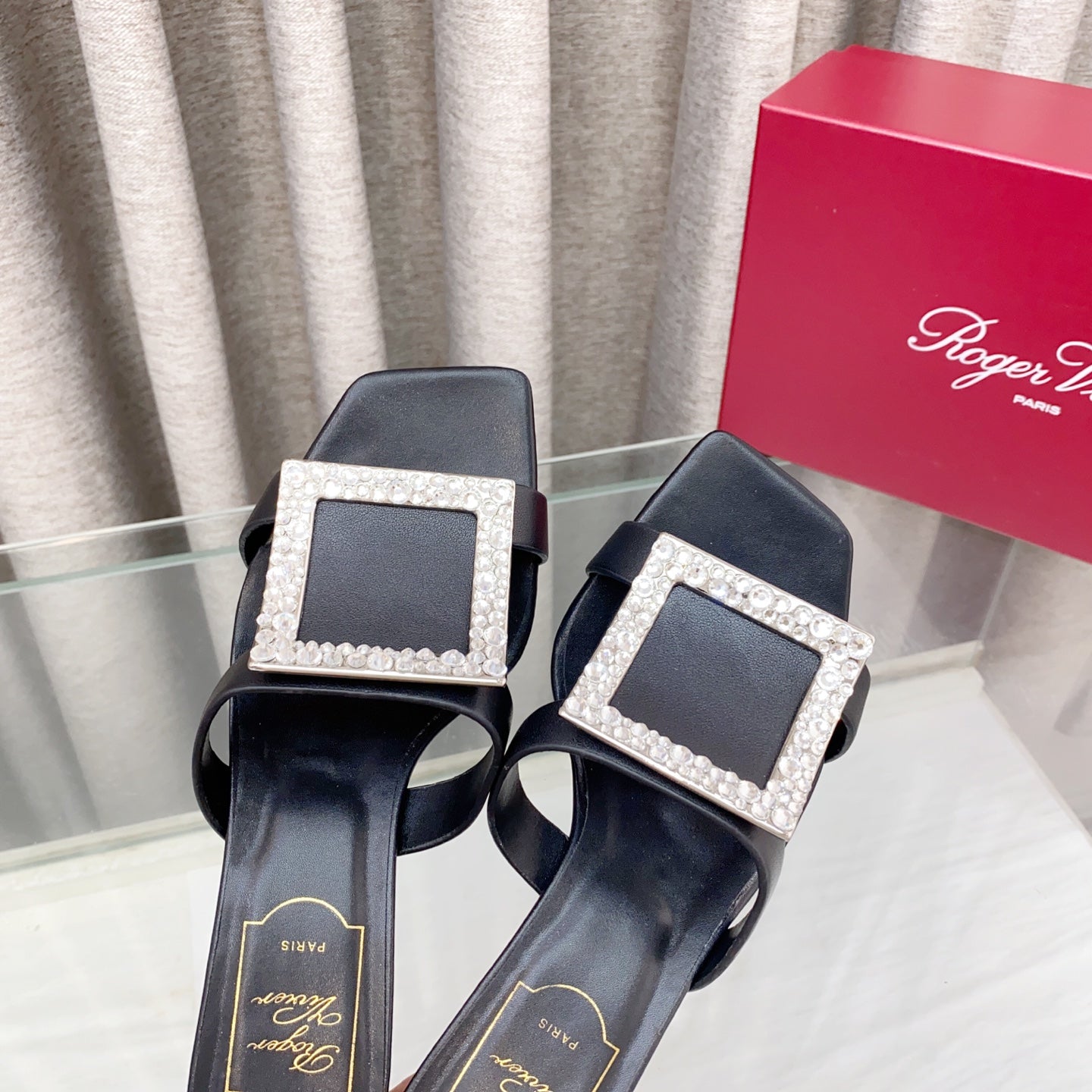 Viv 25 Hollow Square Buckle Slippers Black Weaving Leather 262999