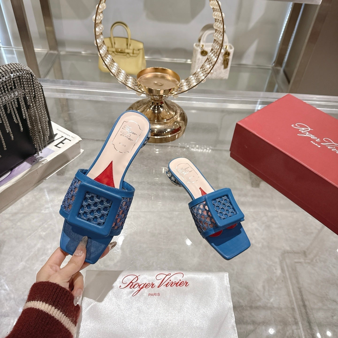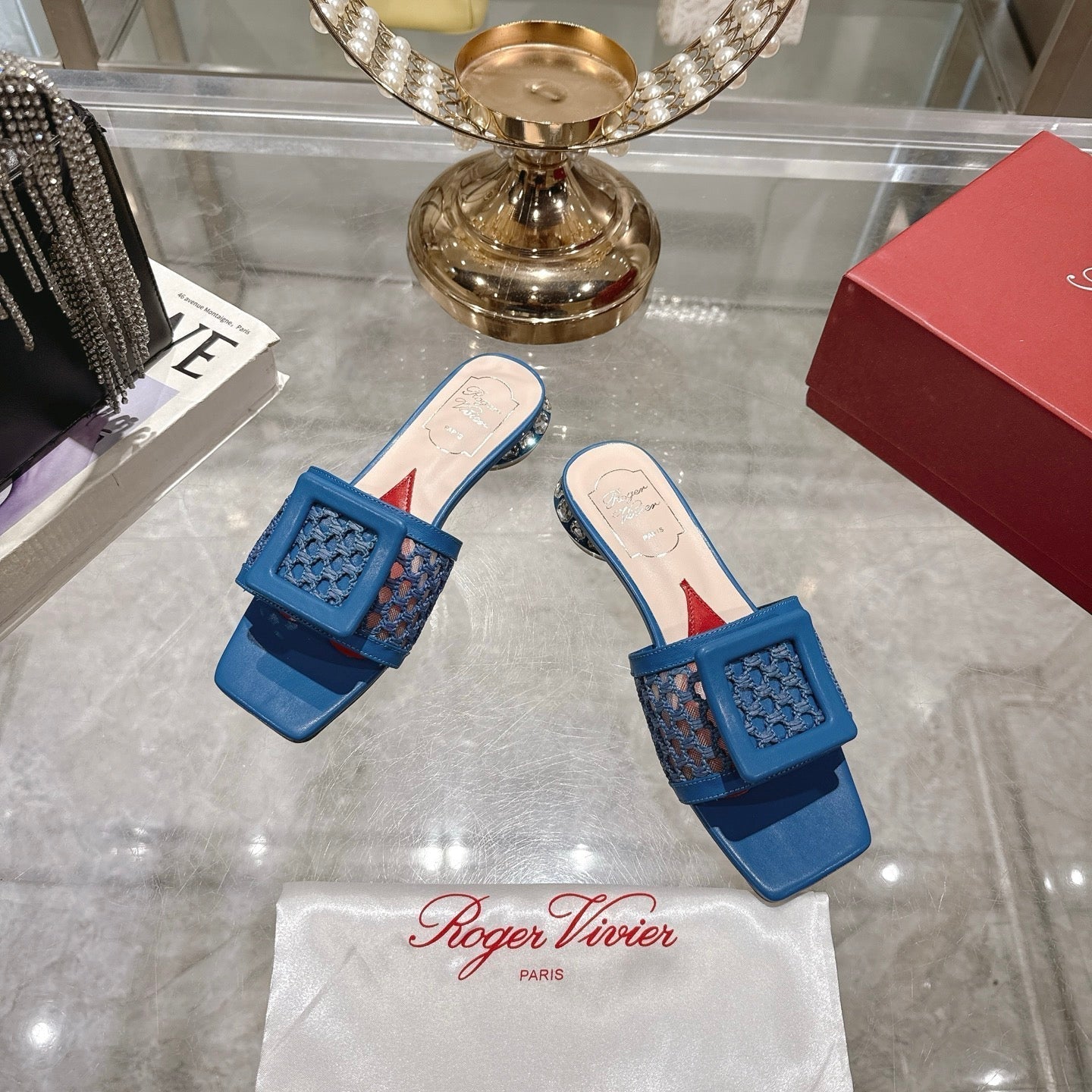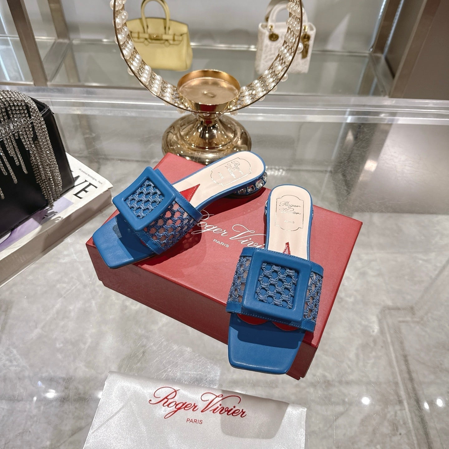 Viv 25 Hollow Square Buckle Slippers Blue Weaving Leather 263000