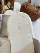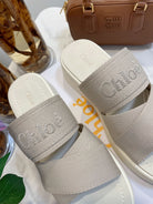 CHLOÉ WOODY WEDGE SANDALS IN DOVE GREY CANVAS WITH WHITE RUBBER SOLE