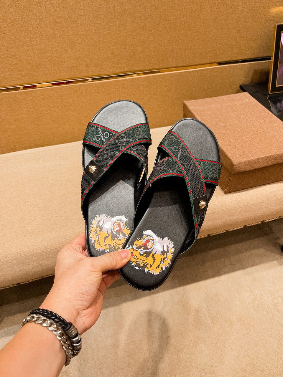GG Men's Sandals Slide Green Black Leather