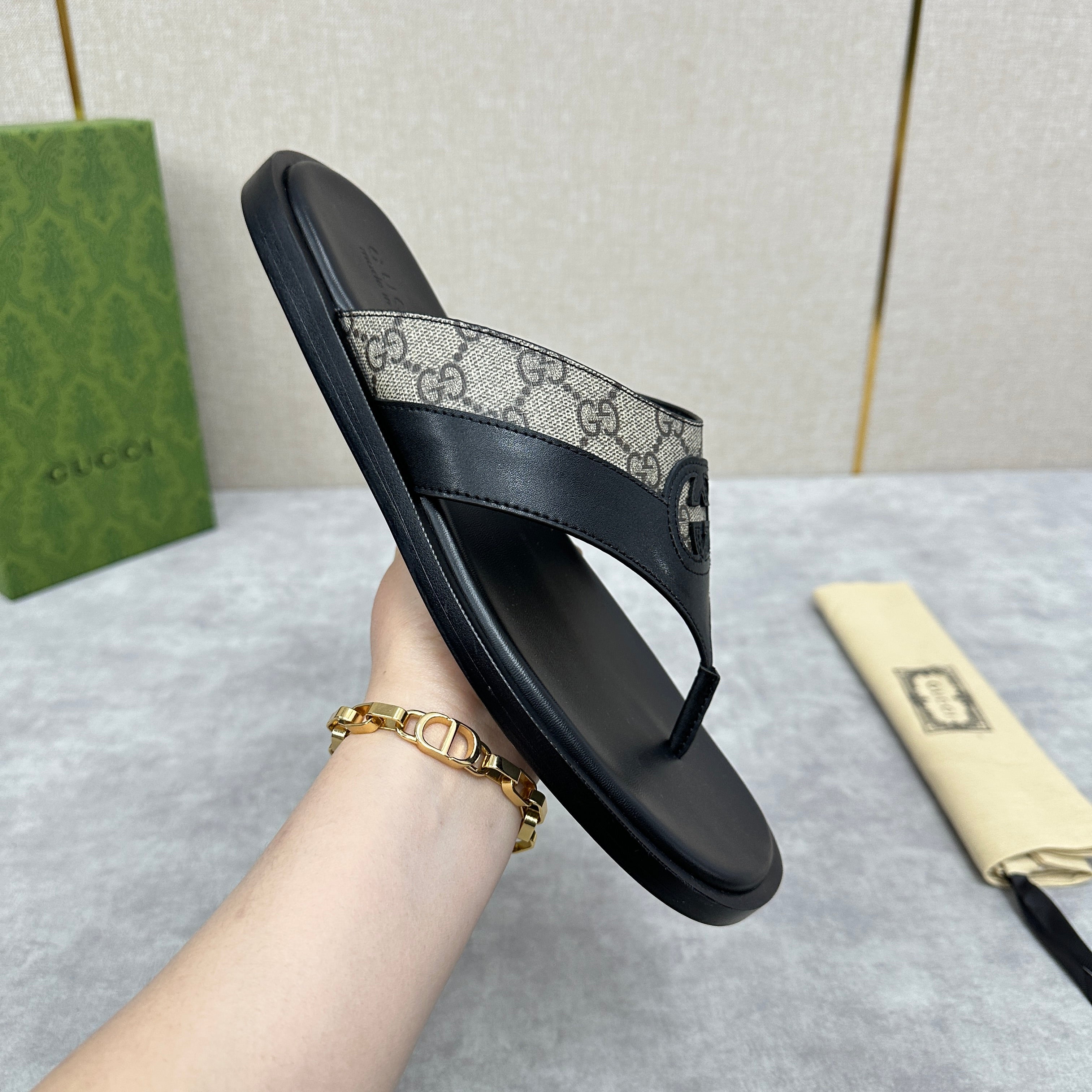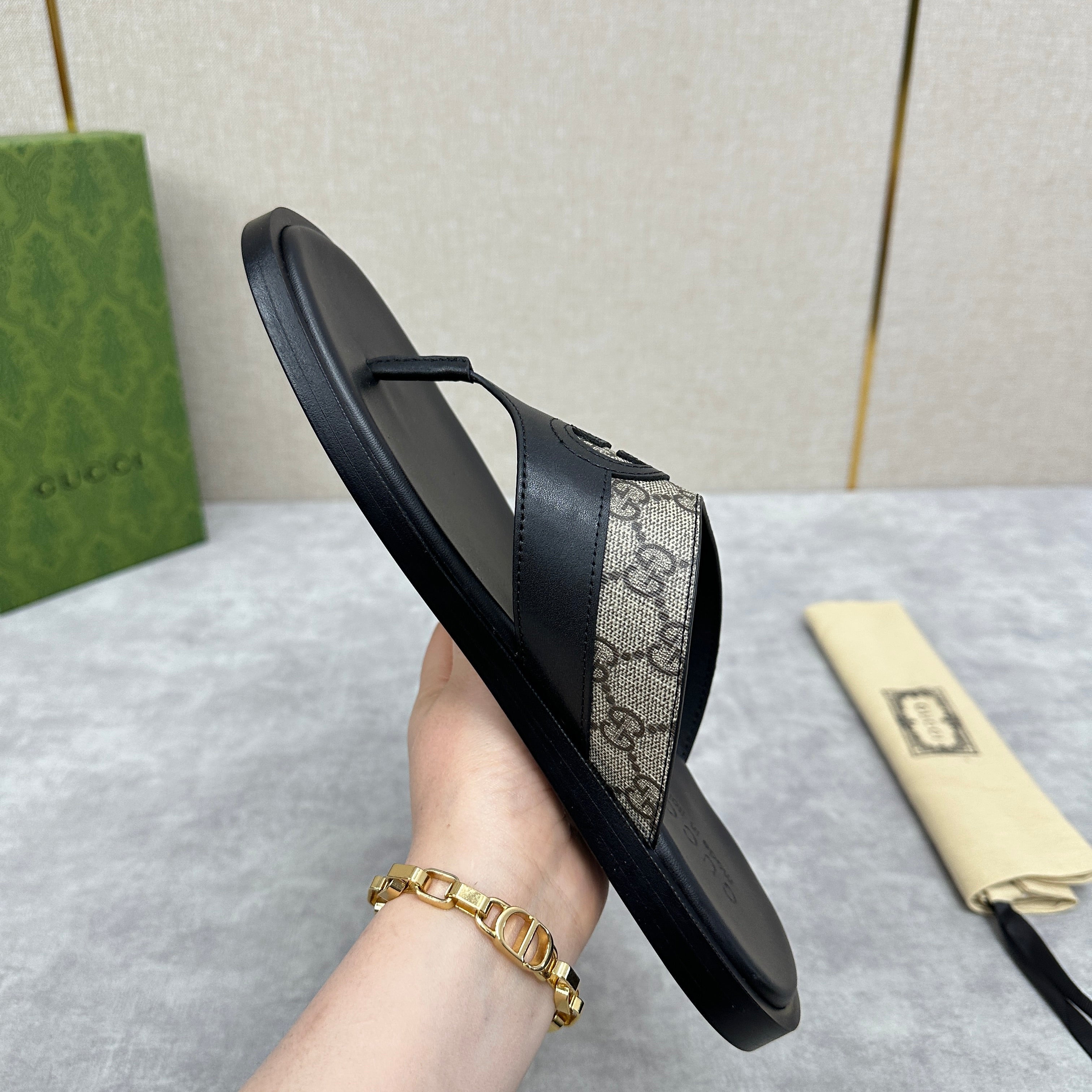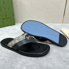 GG Men's Thong Sandals Black Brown Canvas Cowhide 542952