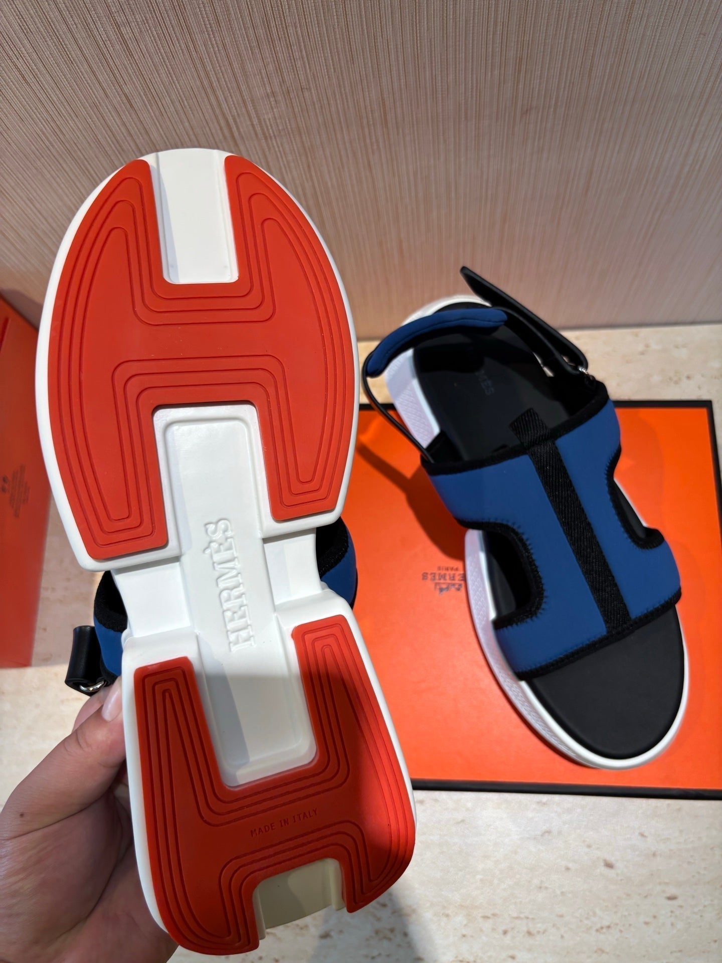 HM Men's Gate Sandal Blue Calfskin Printed Fabric 655431