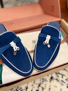 Loro Piana Dark Blue White Suede Charms Walk Flat Mules