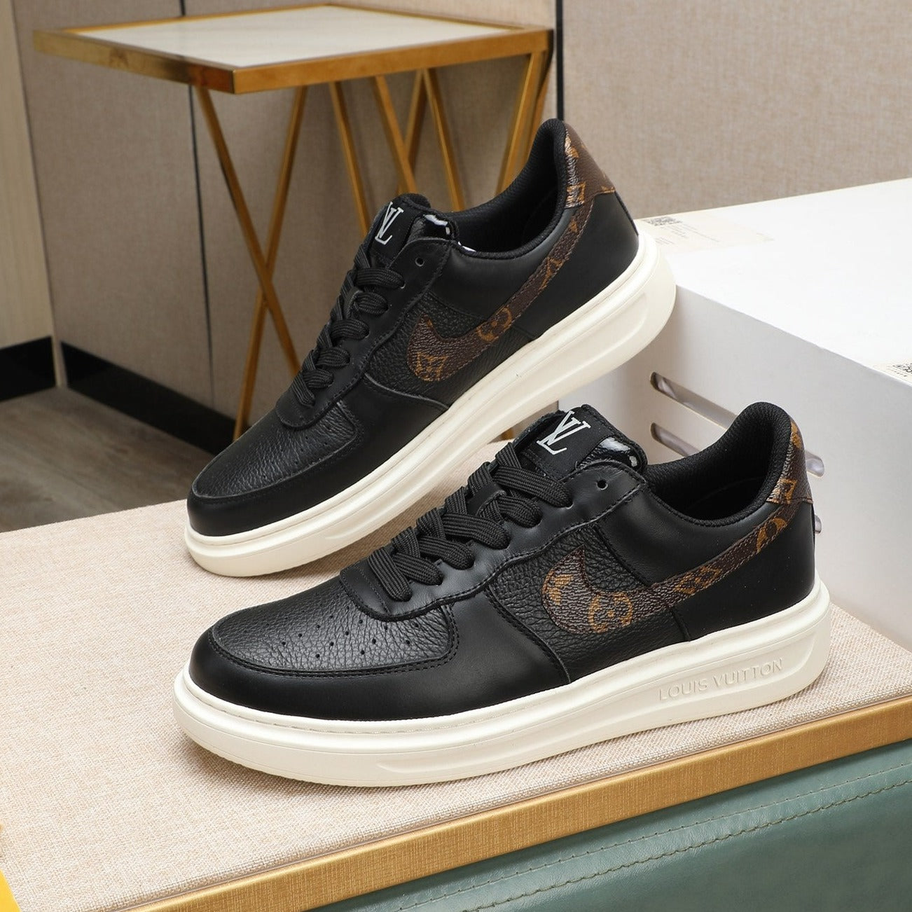 LV AIR FORCE 1 GLOSSY BLACK CALFSKIN WITH BROWN MONOGRAM LOGO