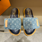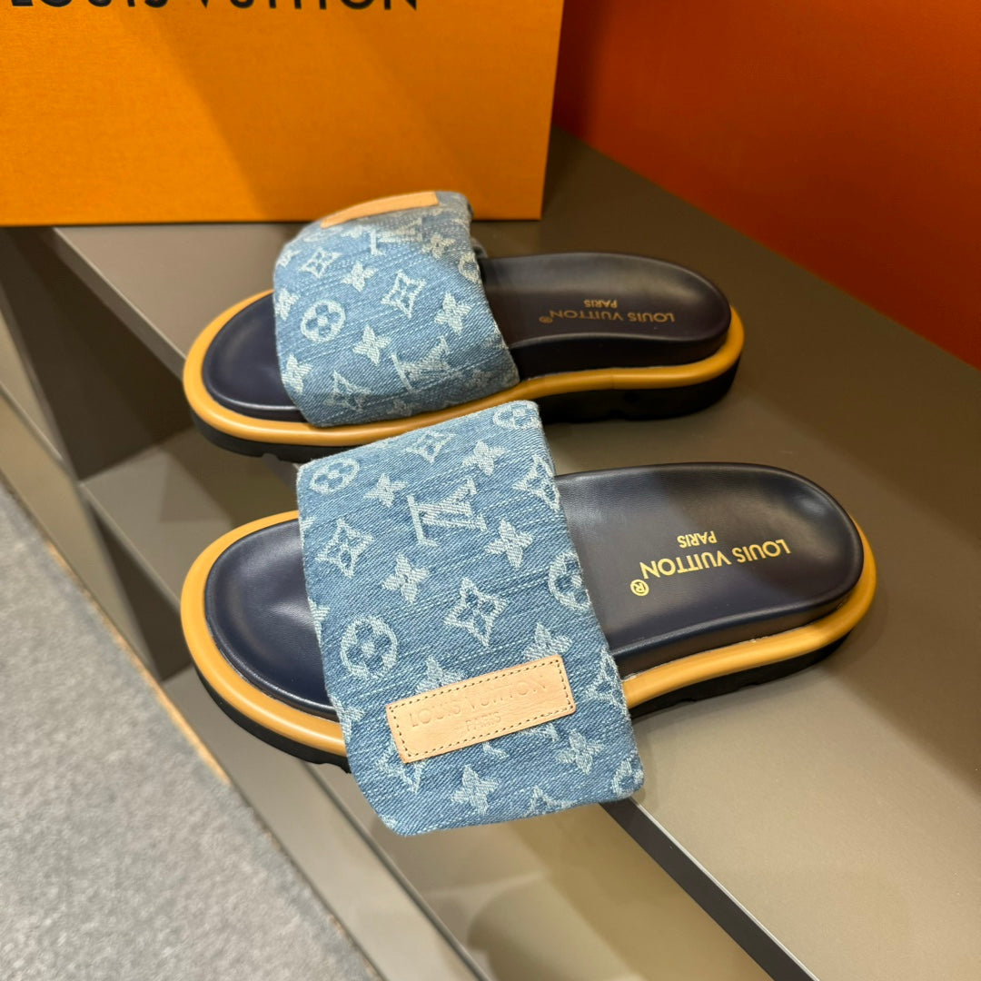 LV VELCRO SLIPPERS IN LIGHT BLUE MONOGRAM DENIM