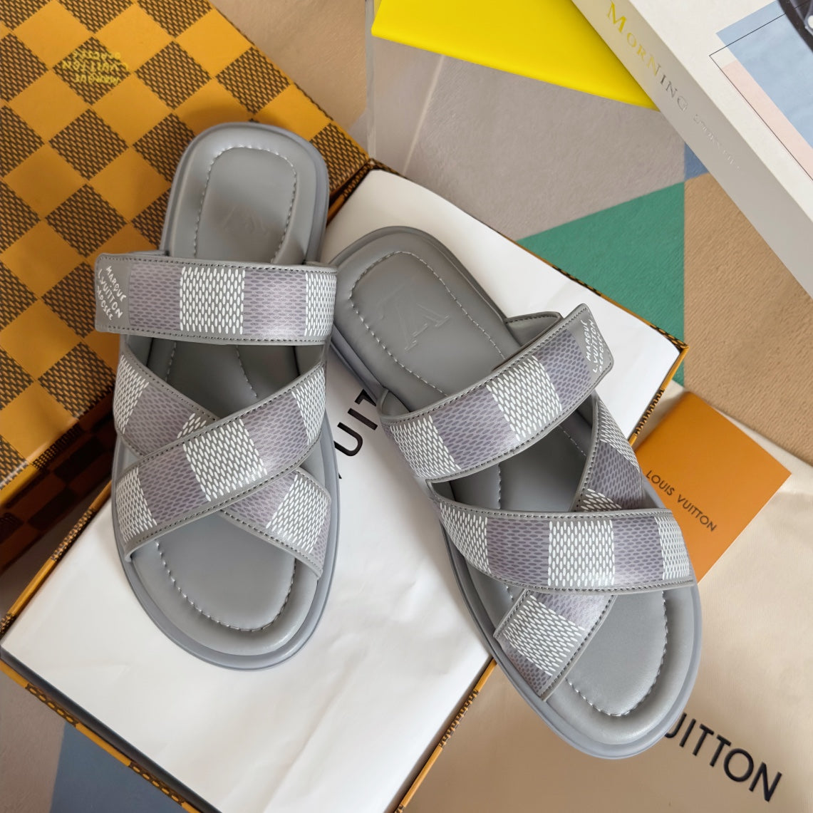 • Premium LV men's slippers, synchronizing with the 2024 early autumn runway collection. The slippers feature a high-quality fabric upper and an original, exclusive comfort sole, ensuring exceptional comfort. These are original factory-followed products.