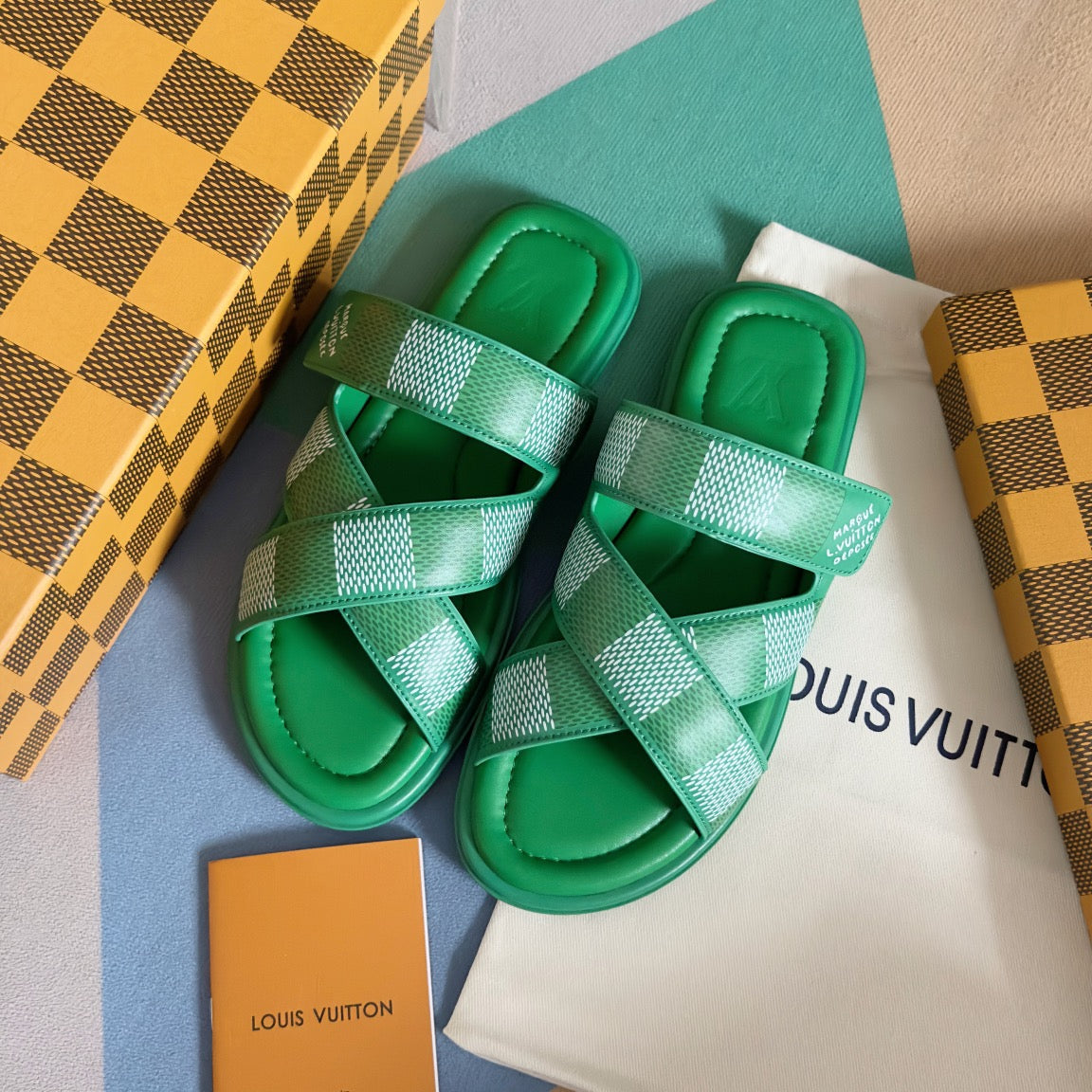 • Premium LV men's slippers, synchronizing with the 2024 early autumn runway collection. The slippers feature a high-quality fabric upper and an original, exclusive comfort sole, ensuring exceptional comfort. These are original factory-followed products.