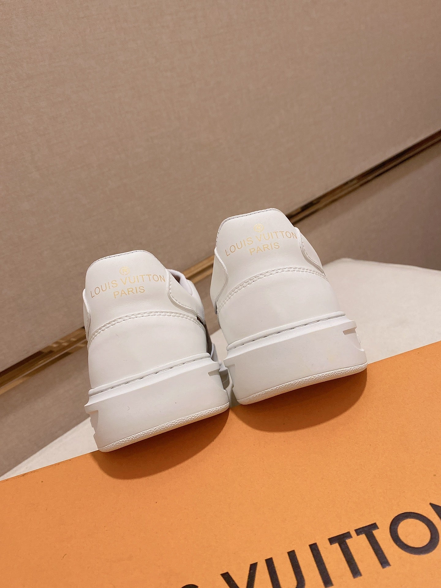LV TRAINER SNEAKER WHITE CALFSKIN MIX CAMEL BEIGE SUEDE