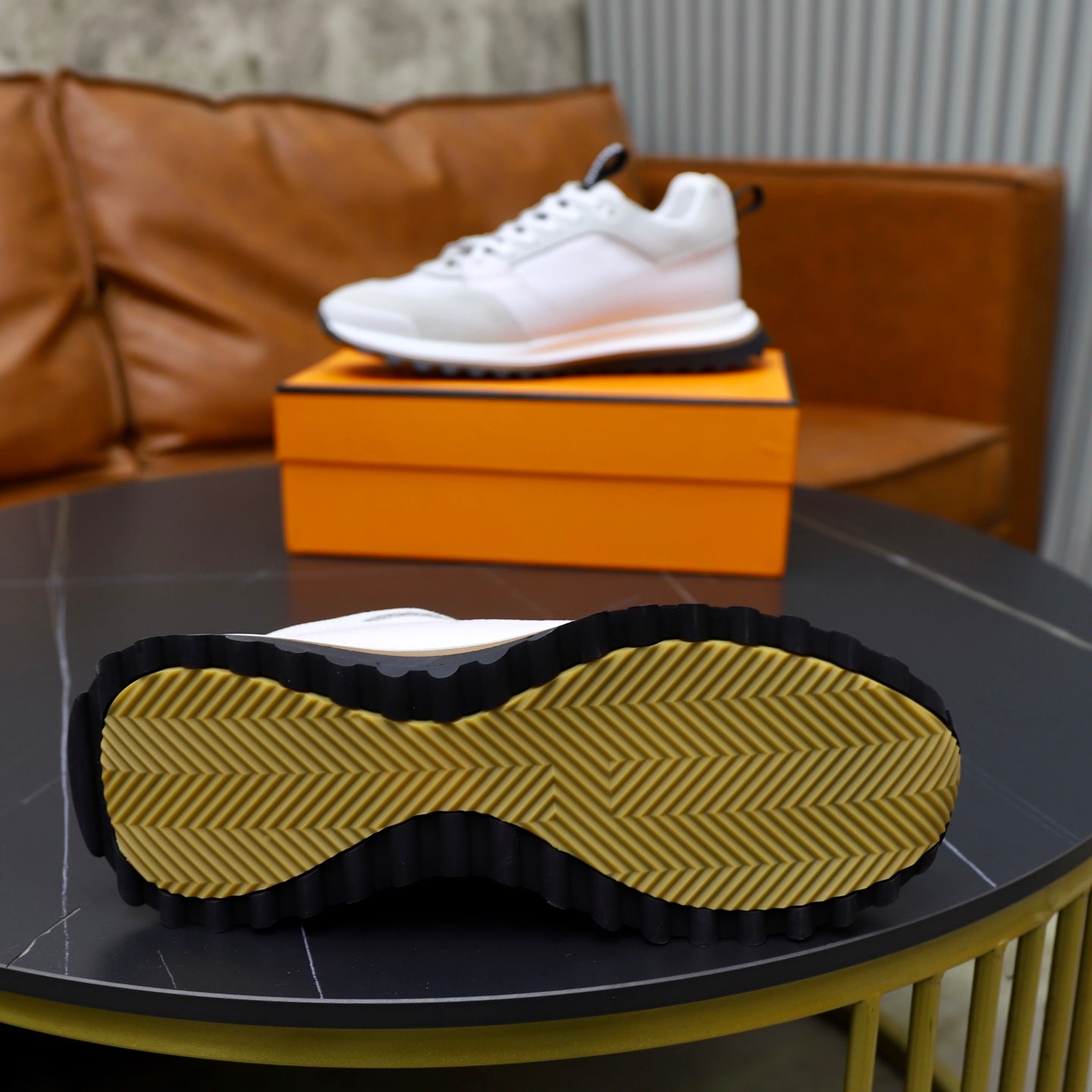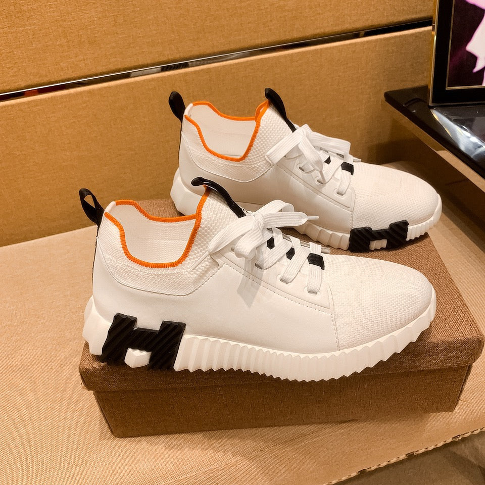HM Men's Bouncing Sneaker White Brown Calfskin Fabric 754130