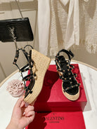 Rockstud Ankle Strap Wedge Sandal In Black Calfskin Leather And Beige Raffia 100mm 829389