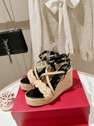 Valentino Garavani Taupe Wedge Rockstud Sandals 10mm In Black Calfskin And Beige Raffia 829385