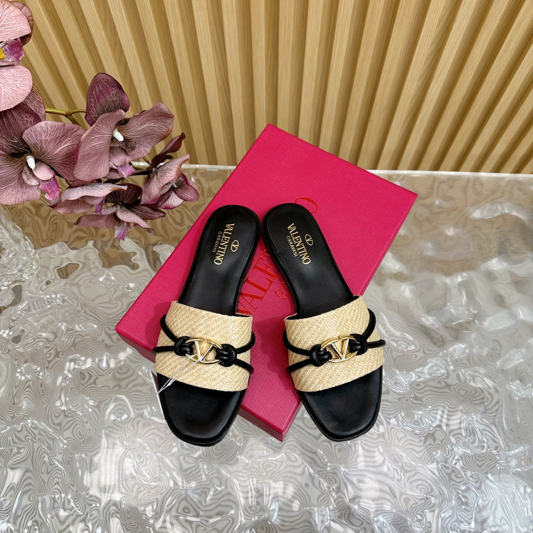 VLogo Raffia-Trimmed Leather Slides In Black Mix Ivory White Sedge Weaving Yarn And Lambskin 102817