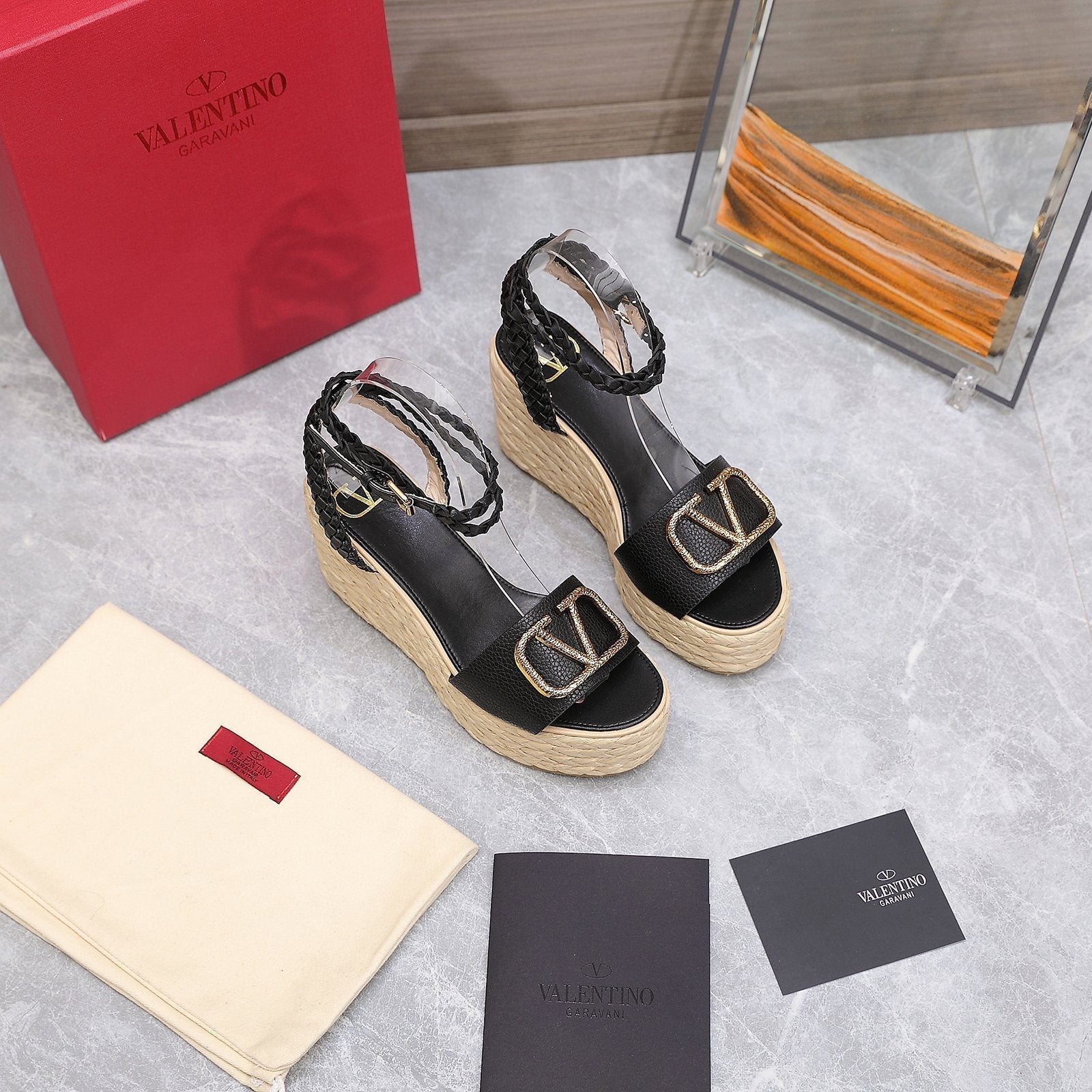 VT Wedge Platform Sandals Black Cowhide Espadrilles 363030