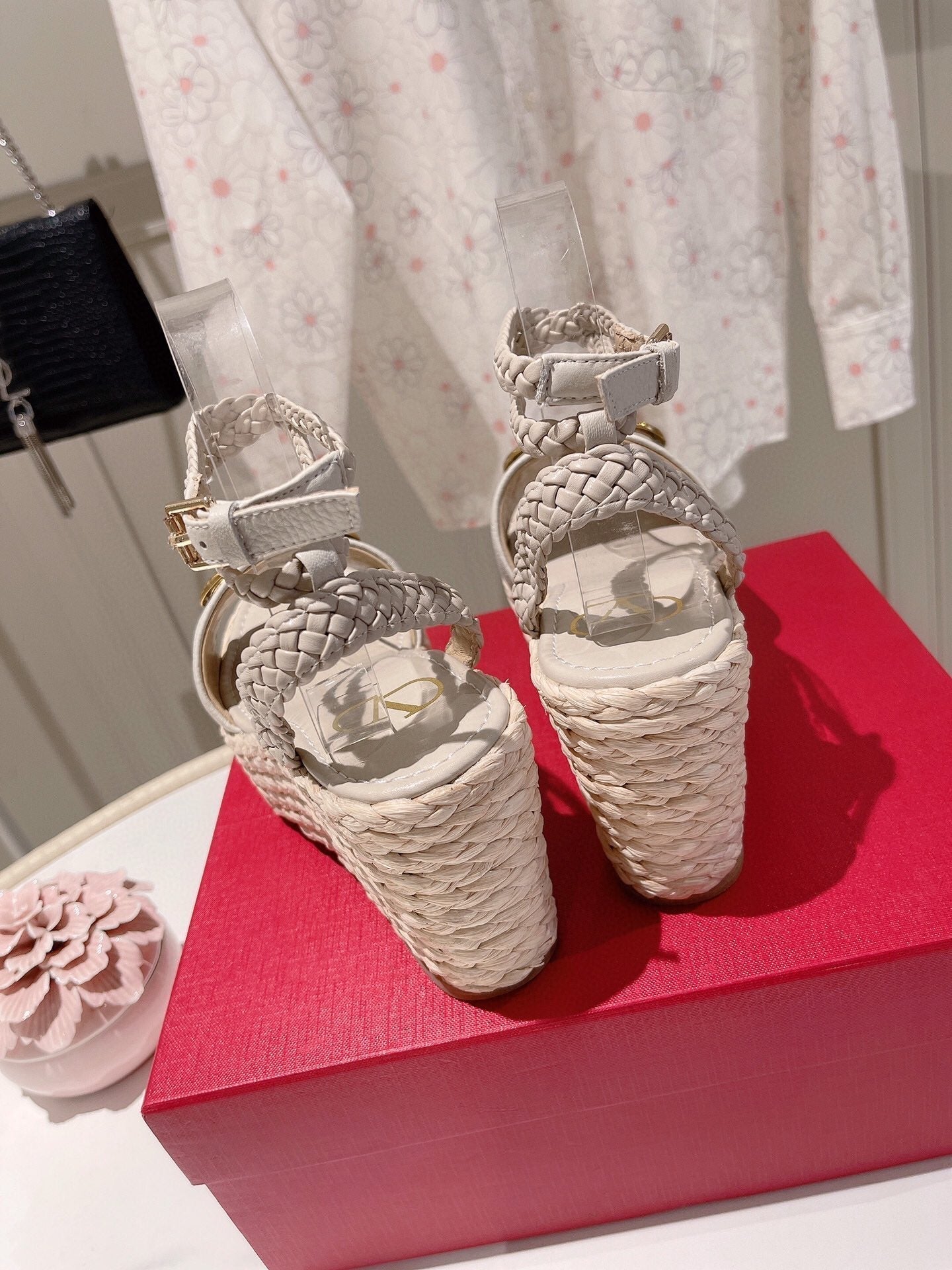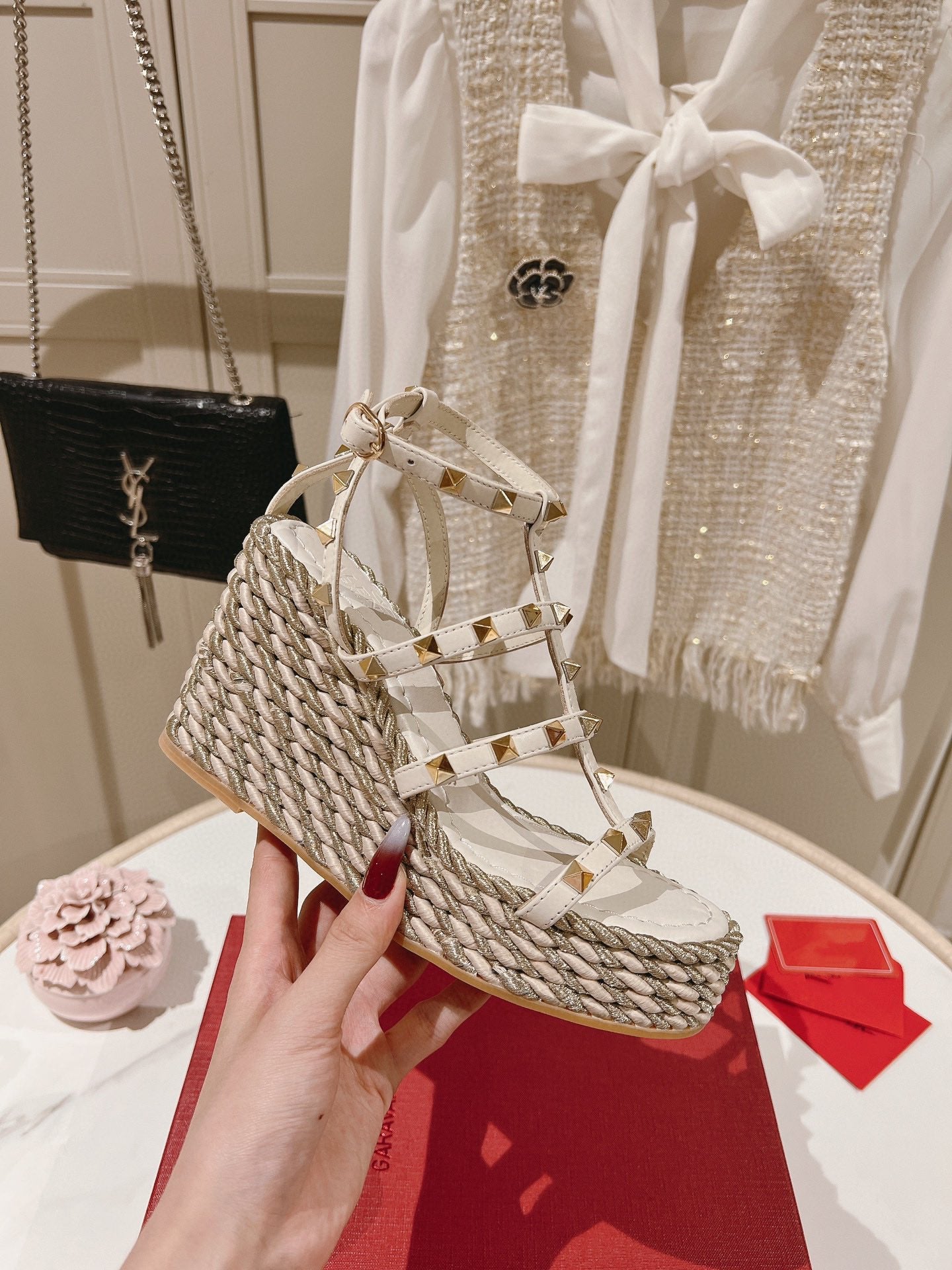 Rockstud Wedge Sandal In Calfskin Leather Poudre 10cm