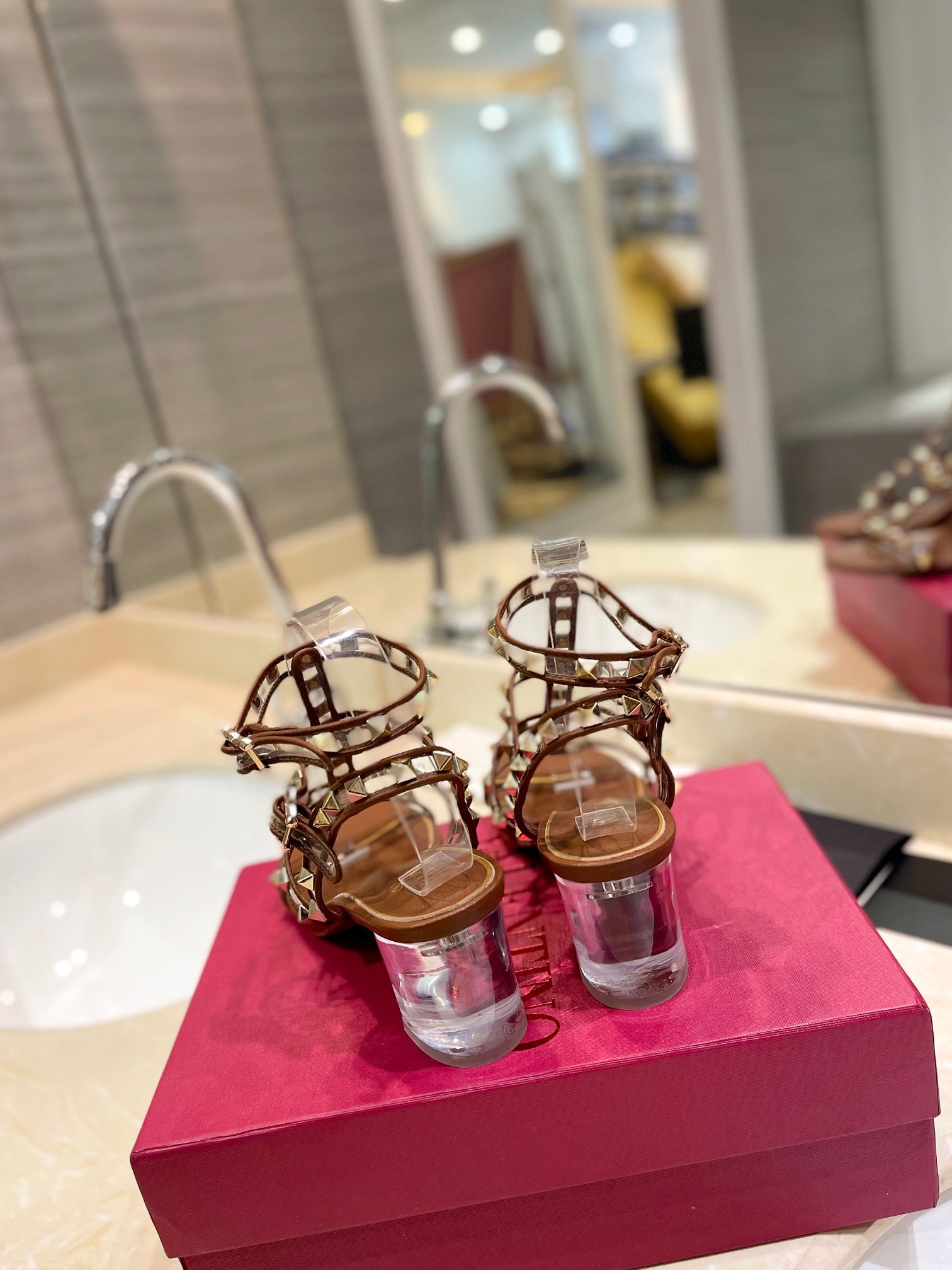 ROCKSTUD SANDAL WITH STRAP IN CAMEL BROWN CALFSKIN 60 MM