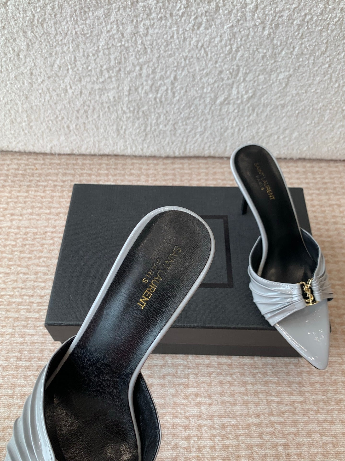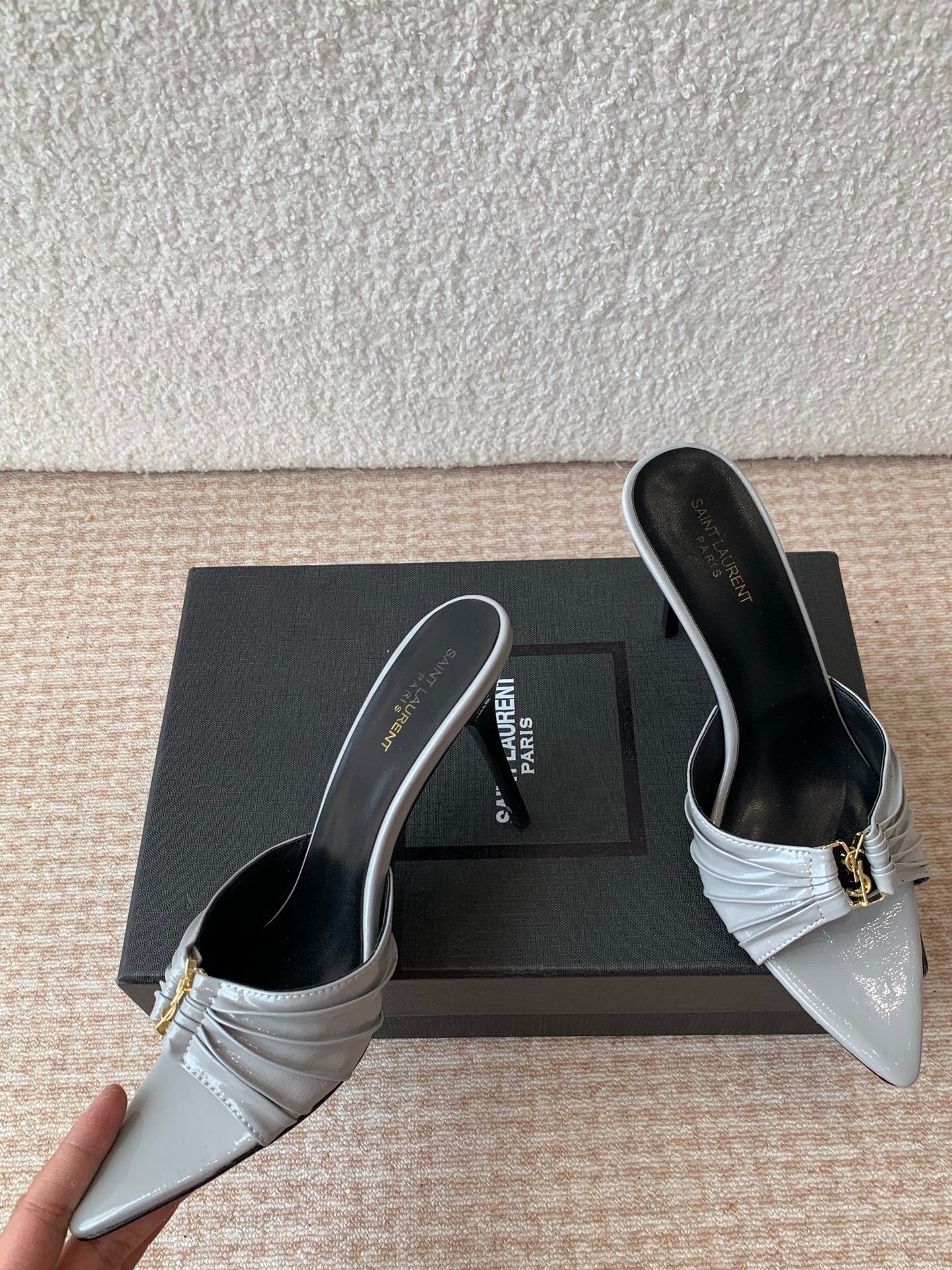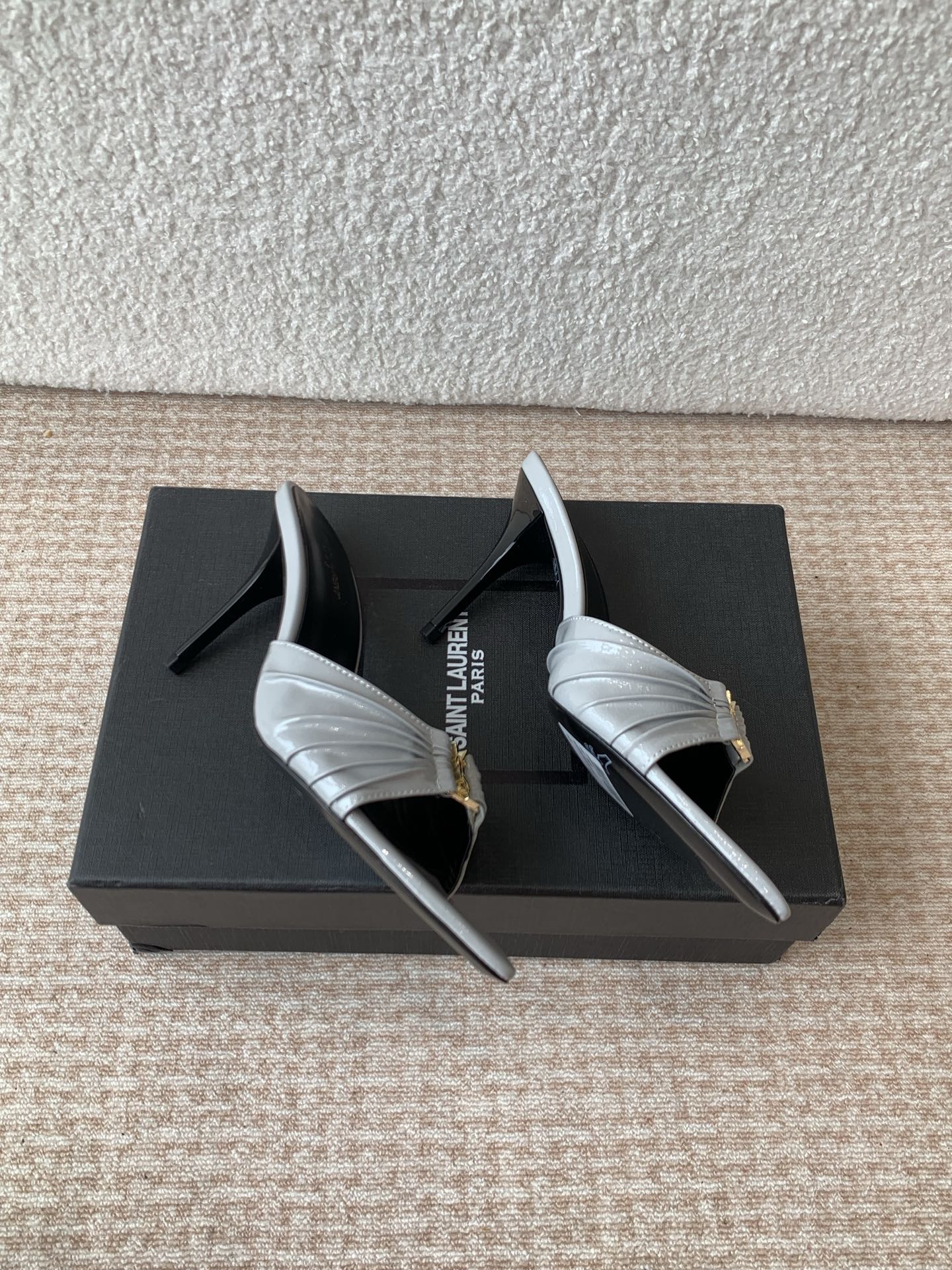 MARTHA POINTED OPEN-TOE HIGH MULES IN GRAY SILK
