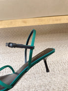 STRAPPY MID HEEL SANDALS IN TEAL GREEN SILK