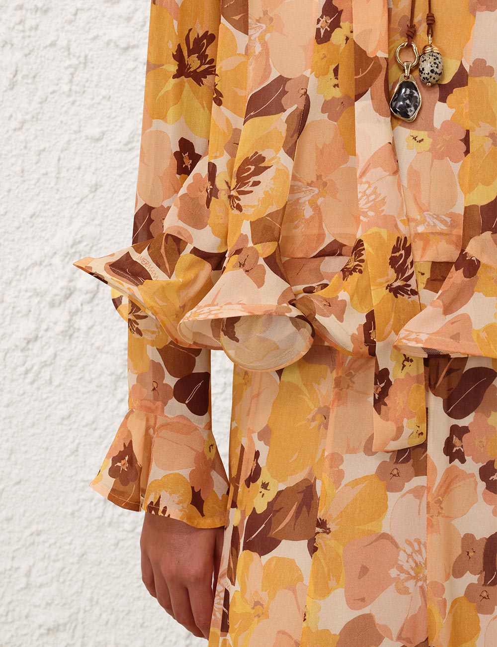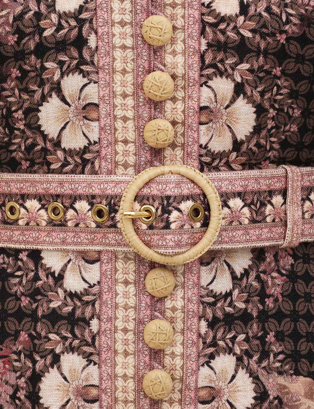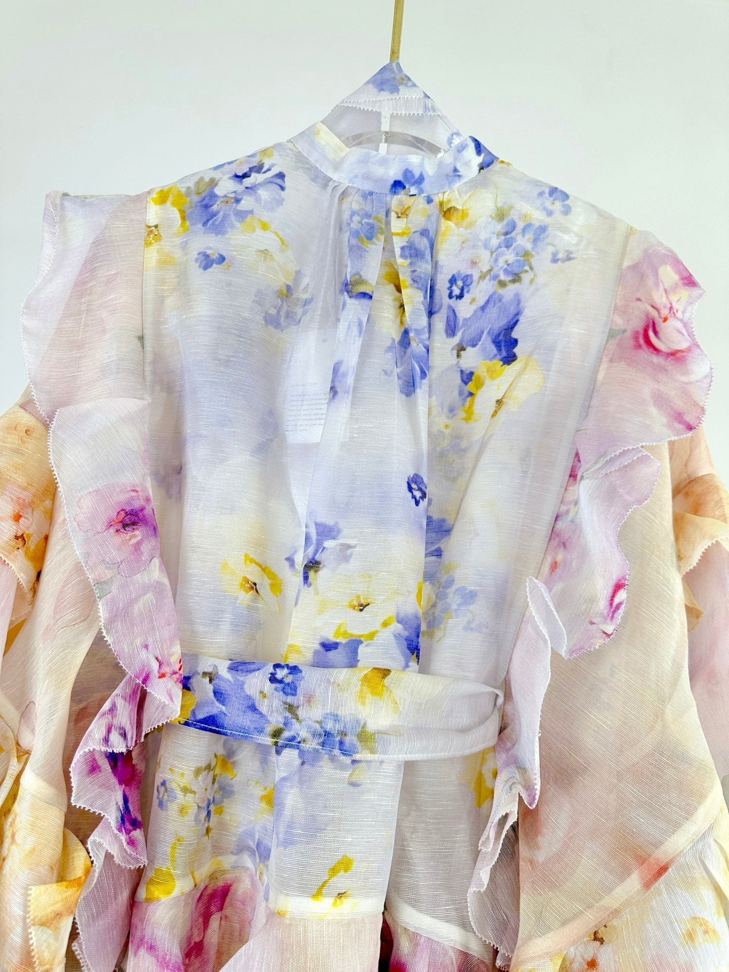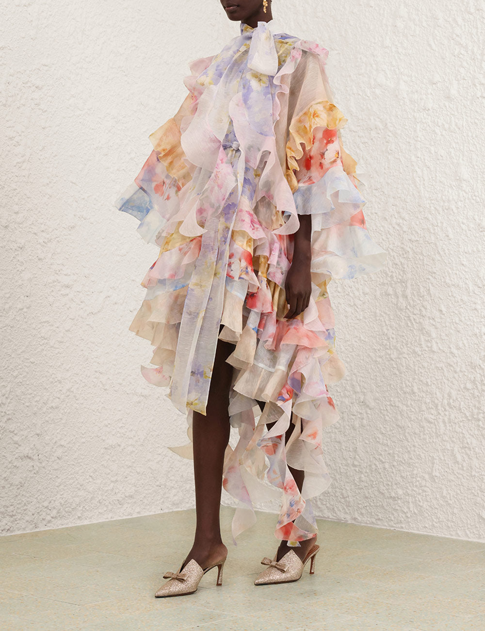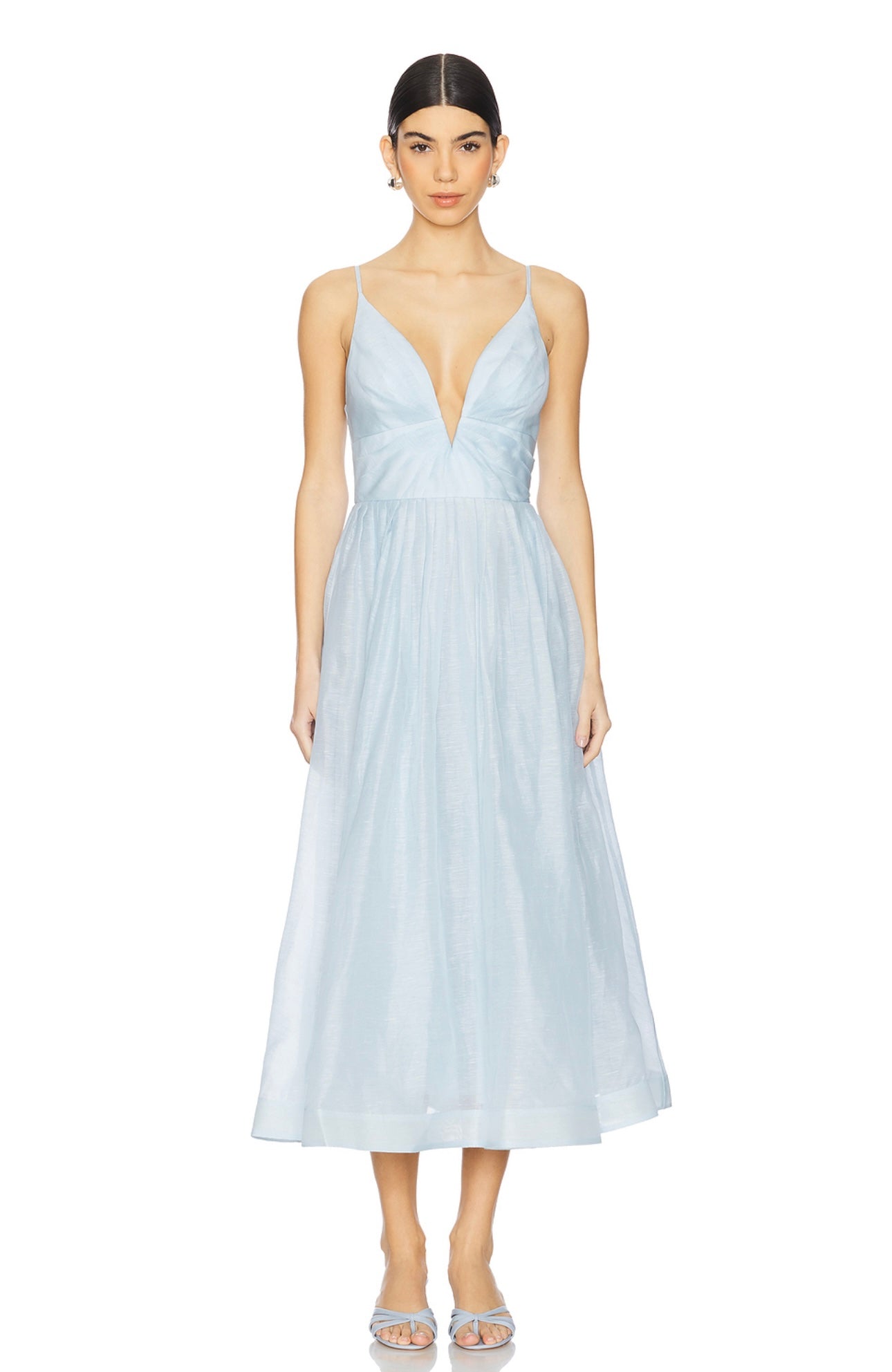 ZIMMERMANN Lucky Plunge Midi Dress Cream/Blue Floral Linen Fabric