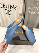 ALAIA FLAT MULES IN CERULEAN BLUE MESH FISHNET