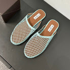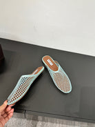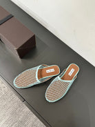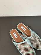ALAIA FLAT MULES IN LIGHT BLUE MESH FISHNET