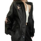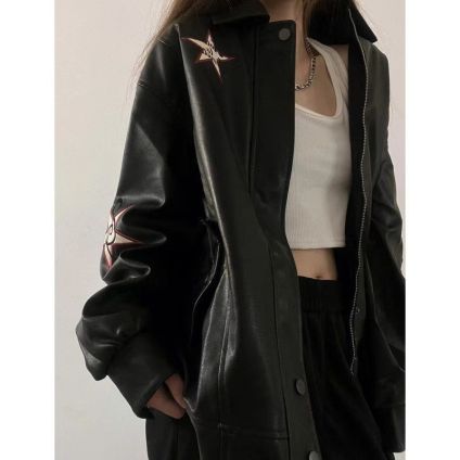 Diese stilvolle Retro-Lederjacke kombiniert klassische Elemente mit modernen Stickereidetails. Das schwarze Leder bietet eine zeitlose und vielseitige Optik, während die dekorativen Akzente einen einzigartigen Charakter verleihen. Die Jacke ist leicht und bequem, perfekt für den täglichen Gebrauch oder als modisches Statement.