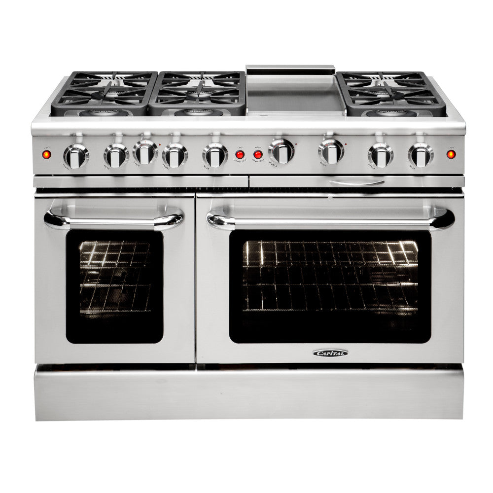 Capital Cooking has perfected the form and function of stainless steel gas ranges. The Precision 48" Gas Range features the ultimate in performance and control with proven durability, featuring sealed burners that offer precise control from the highest highs to the lowest lows and a large-capacity gas convection oven with an infrared broiler that sears quickly and evenly.
