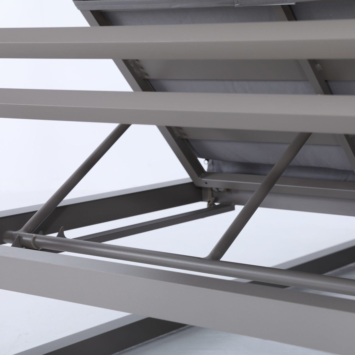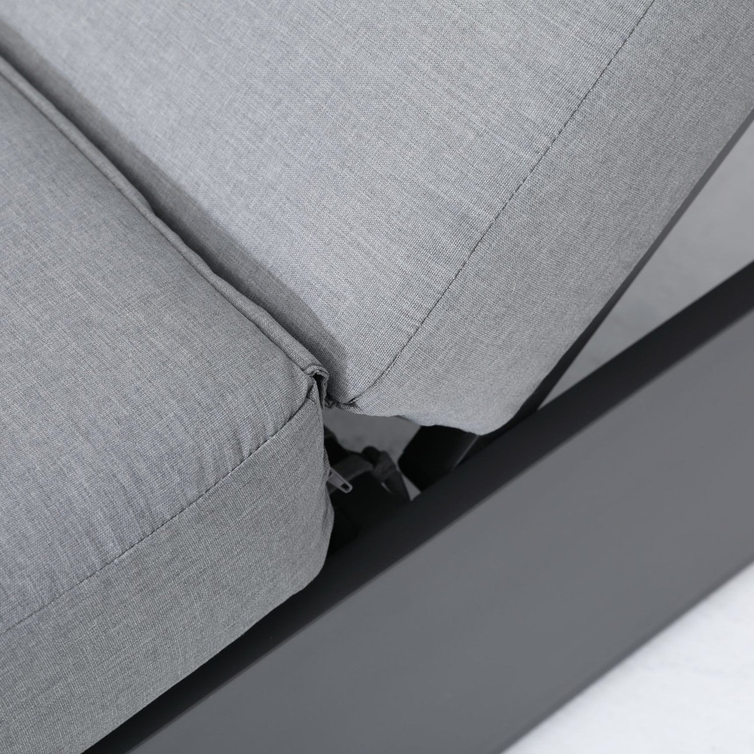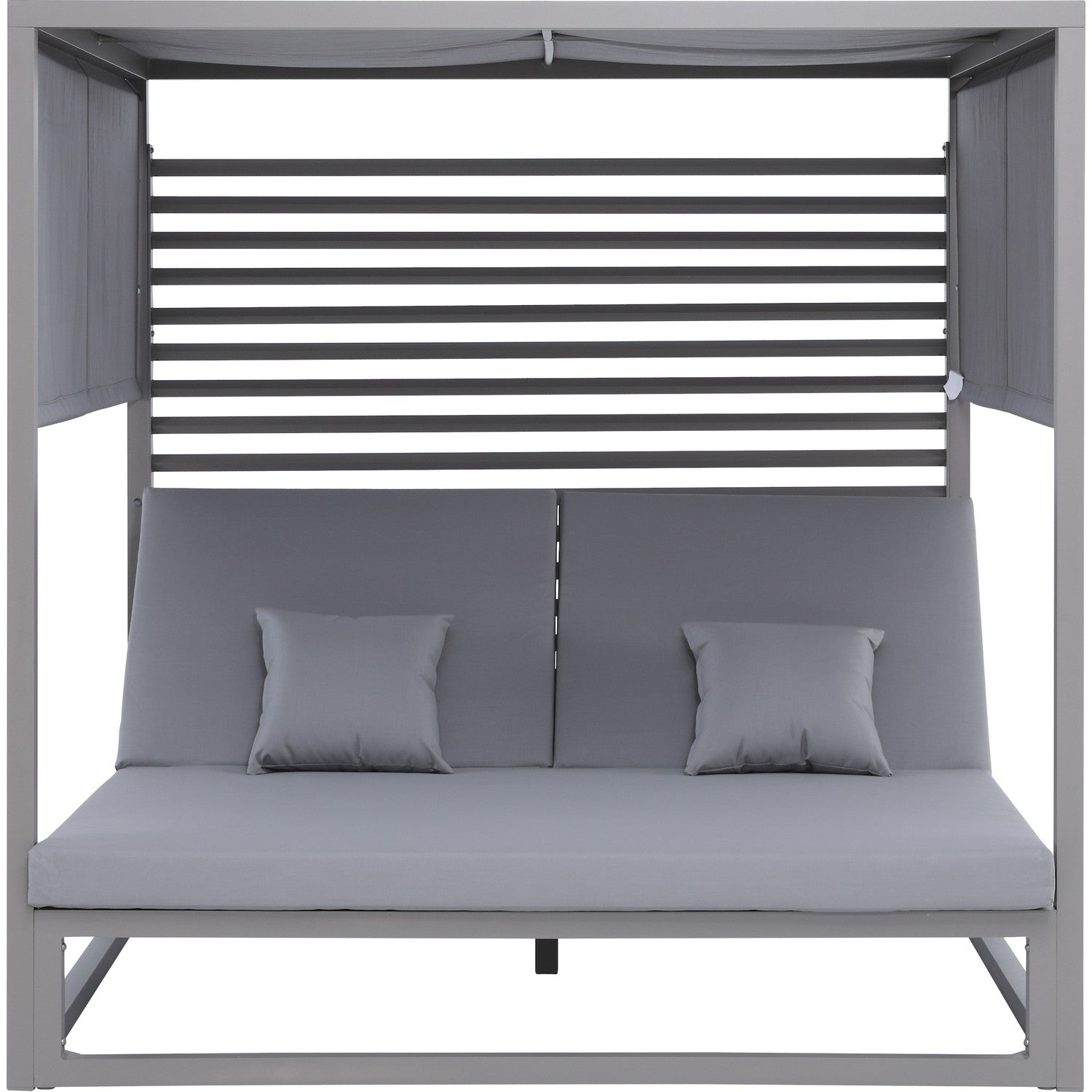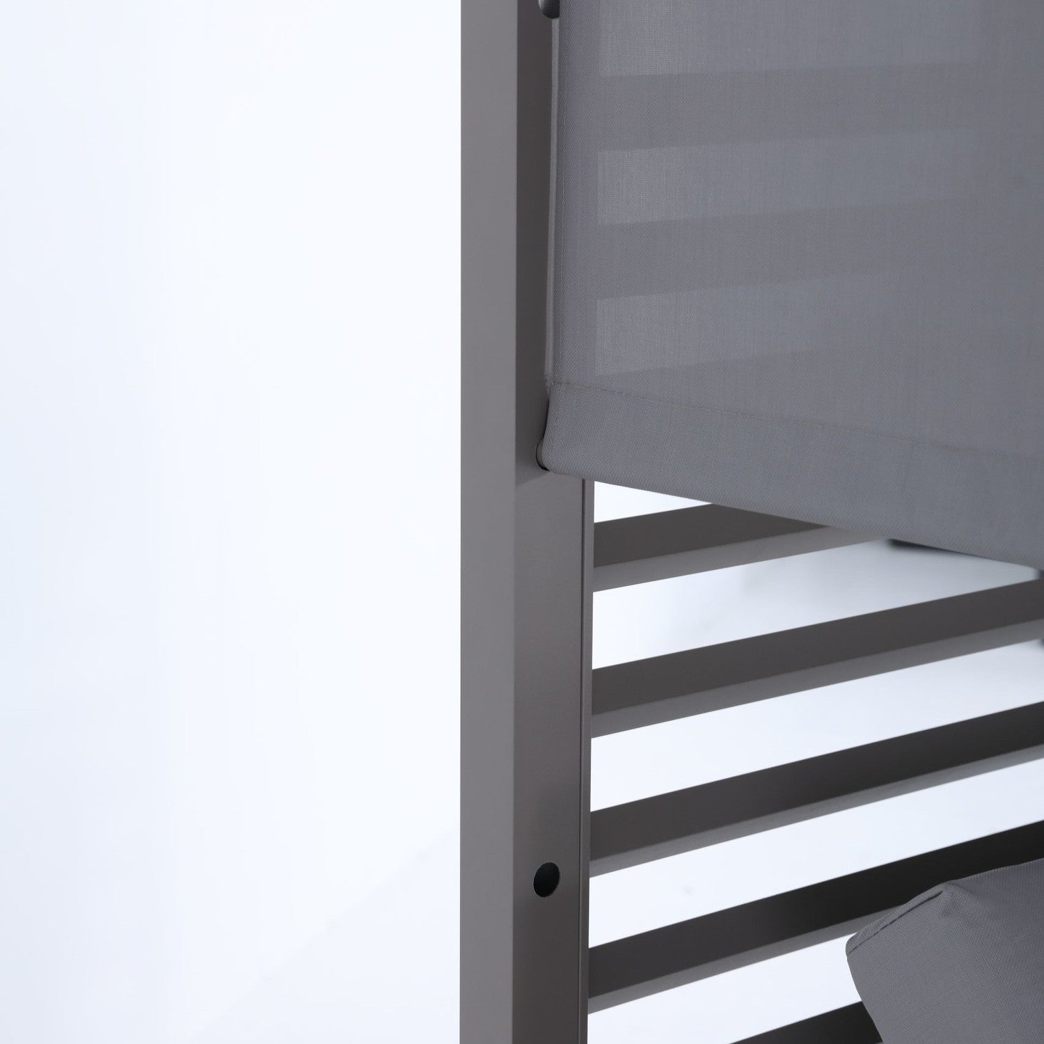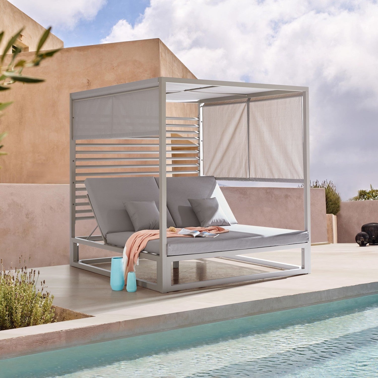 Create an oasis with this lovely Avola Daybed, make it the centerpiece of your backyard sanctuary. This spacious and comfortable daybed is perfect for enjoying lazy summer days and long summer nights. Stylishly covered cushions with fabric upholstery is supported by a steel frame to create 2 dual adjustable sunbeds from either side. The base of the bed is made from aluminum and is mounted on wooden feet. The grey canopy curtain tie-backs are excellent for providing privacy or shade on hot sunny days.