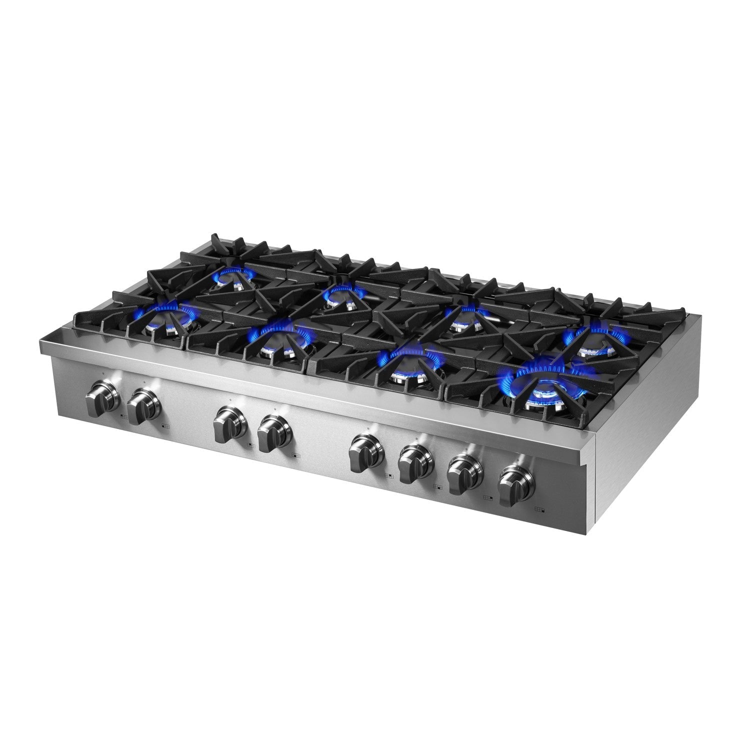The FORNO ALTA QUALITA 48” Gas Rangetop has a versatile cooktop configuration with 8 sealed burners totalling 107,000 BTUs to handle any culinary challenge. Continuous cast iron grates simplify moving pans around without lifting them off the surface and contoured Zinc Control Knobs allow easy control of the burners for precision gas cooking. Includes Auto-ignition, Griddle, Wok-Ring and LP conversion Kit. Heavy-duty 430 stainless steel cleans easily and beautifully complements other Forno appliances to fit any kitchen design.