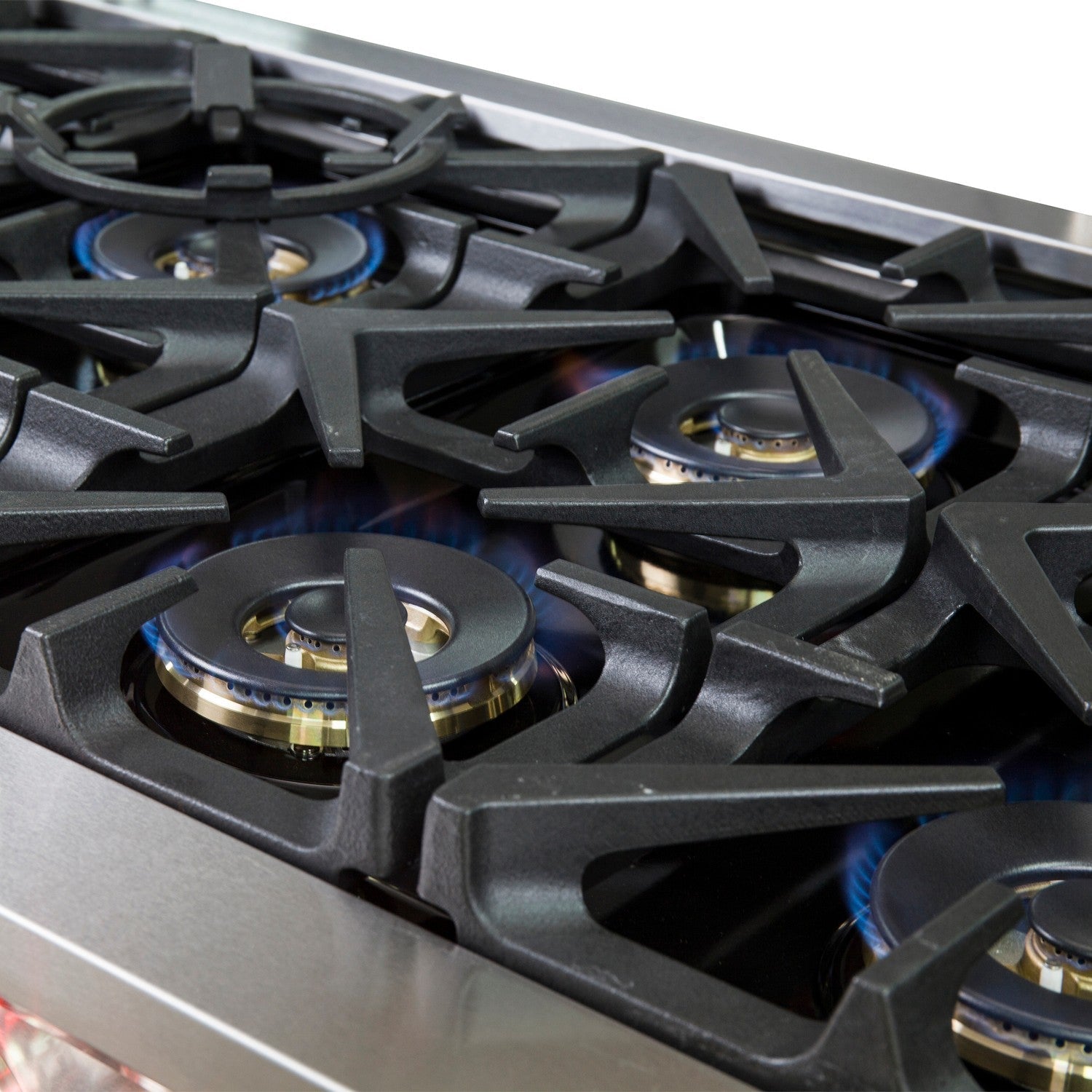 This 60" Pro-Style Gas Range by Forno offers a 10 Italian Brass Burner cooktop and a 8.64 cu. ft. oven. The range also features cast-iron grates, convection fan, and halogen lighting.