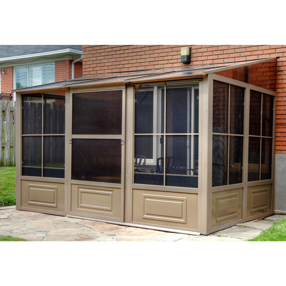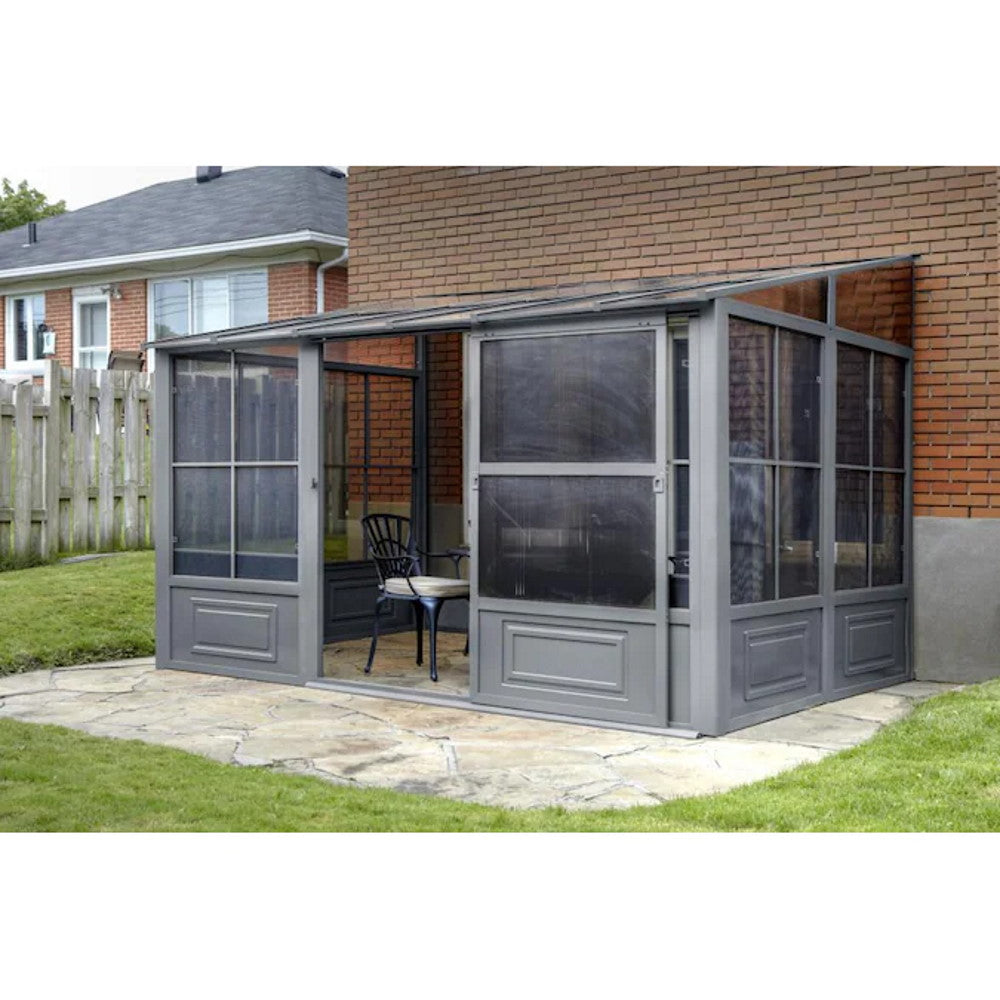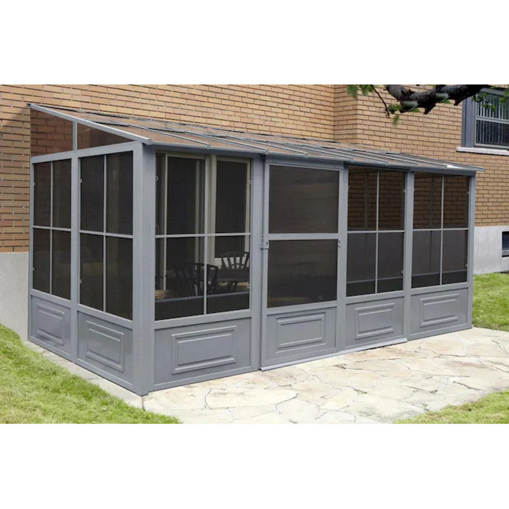 Extend the enjoyment of your outdoor space with our add-a-room solarium. This unit can be left up year-round, saving yourself the trouble of assembling and disassembling at the end of the season. The solarium is constructed of aluminum and features a roof made of a reinforced polycarbonate or a galvanized sheet, 2 sliding doors that you can set to open to the right or left in the position of your choice, and 5-position wind panels. This unit has been carefully designed to withstand exposure to rain, snow, and harsh UV rays. This item is not insulated but you can still enjoy the extra lounge space to accommodate friends and family during various social festivities and relaxing spa days when the weather allows it.
