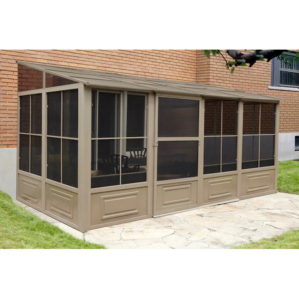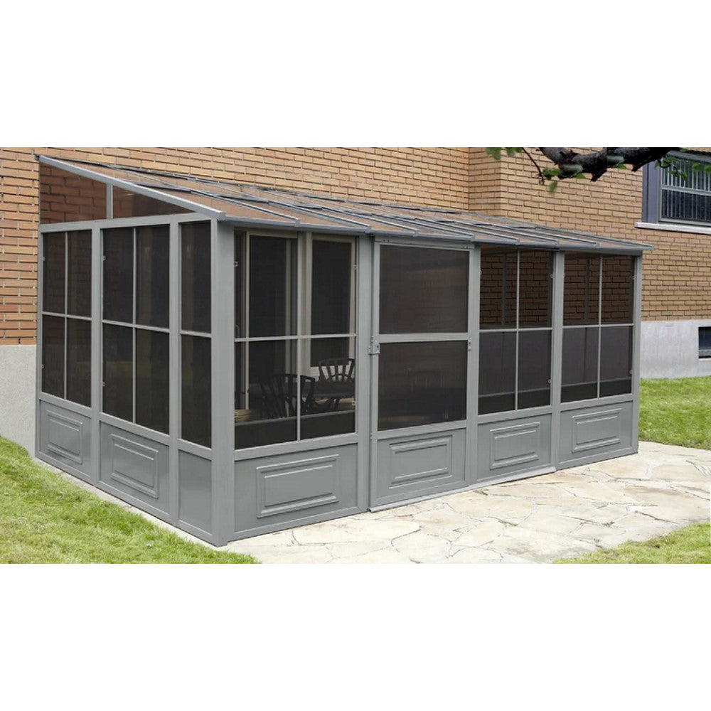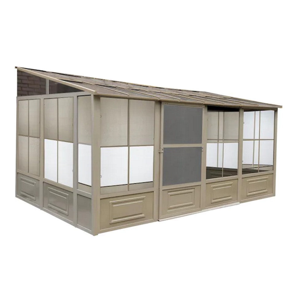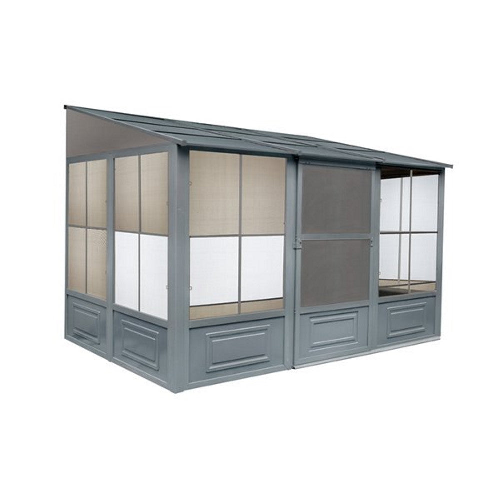 Extend the enjoyment of your outdoor space with our add-a-room solarium. This unit can be left up year-round, saving yourself the trouble of assembling and disassembling at the end of the season. The solarium is constructed of aluminum and features a roof made of a reinforced polycarbonate or a galvanized sheet, 2 sliding doors that you can set to open to the right or left in the position of your choice, and 5-position wind panels. This unit has been carefully designed to withstand exposure to rain, snow, and harsh UV rays. This item is not insulated but you can still enjoy the extra lounge space to accommodate friends and family during various social festivities and relaxing spa days when the weather allows it.