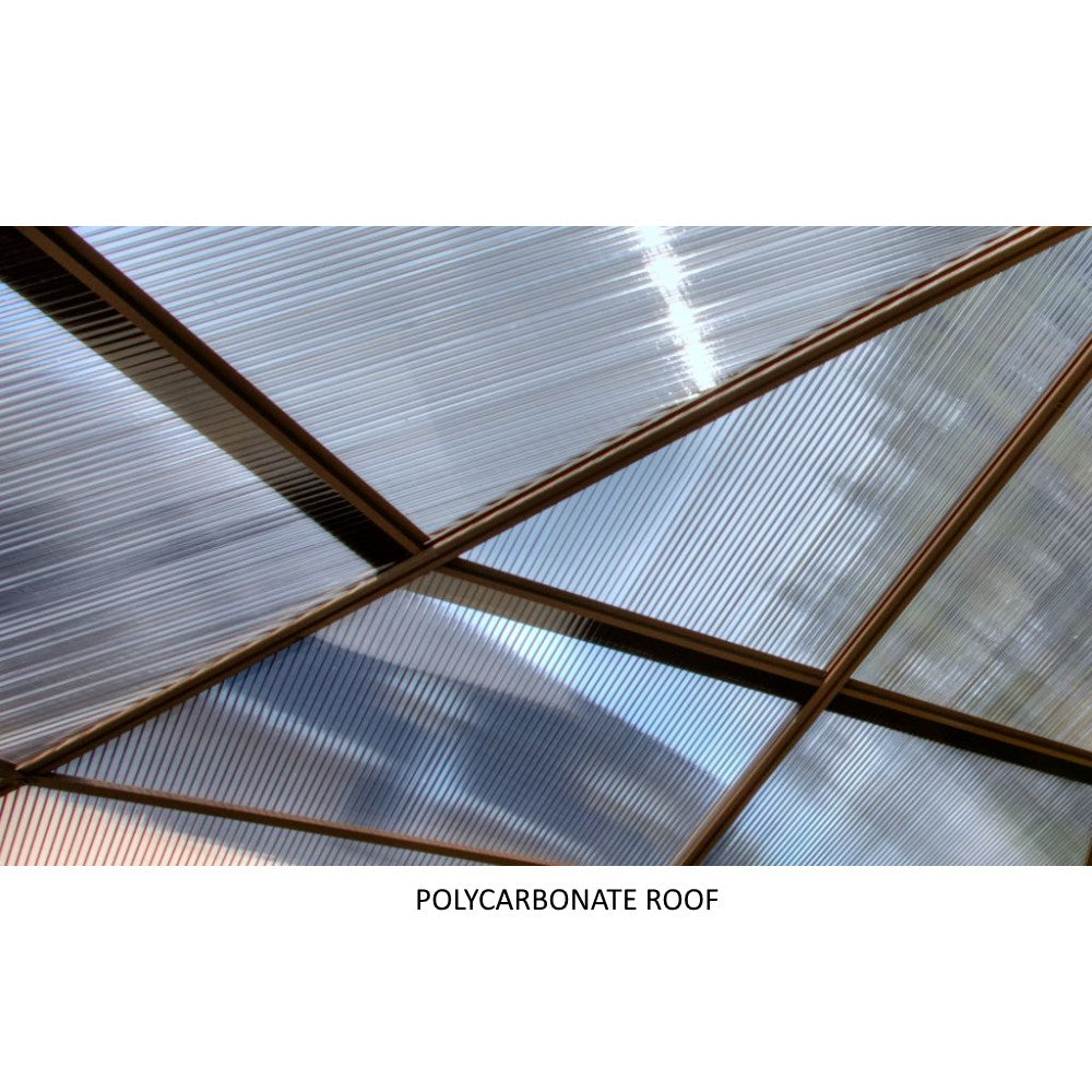 Extend the enjoyment of your outdoor space with our solarium. This unit can be left up year-round, saving yourself the trouble of assembling and disassembling at the end of the season. The solarium is constructed of extruded aluminum and features a roof made of a reinforced polycarbonate or a galvanized sheet, 2 sliding doors that you can set to open to the right or left in your choice position, and 5-position wind panels. This unit has been carefully designed to withstand exposure to rain, snow, and harsh UV rays. This item is not insulated but you can still enjoy the extra lounge space to accommodate friends and family during various social festivities and relaxing spa days when the weather allows it.