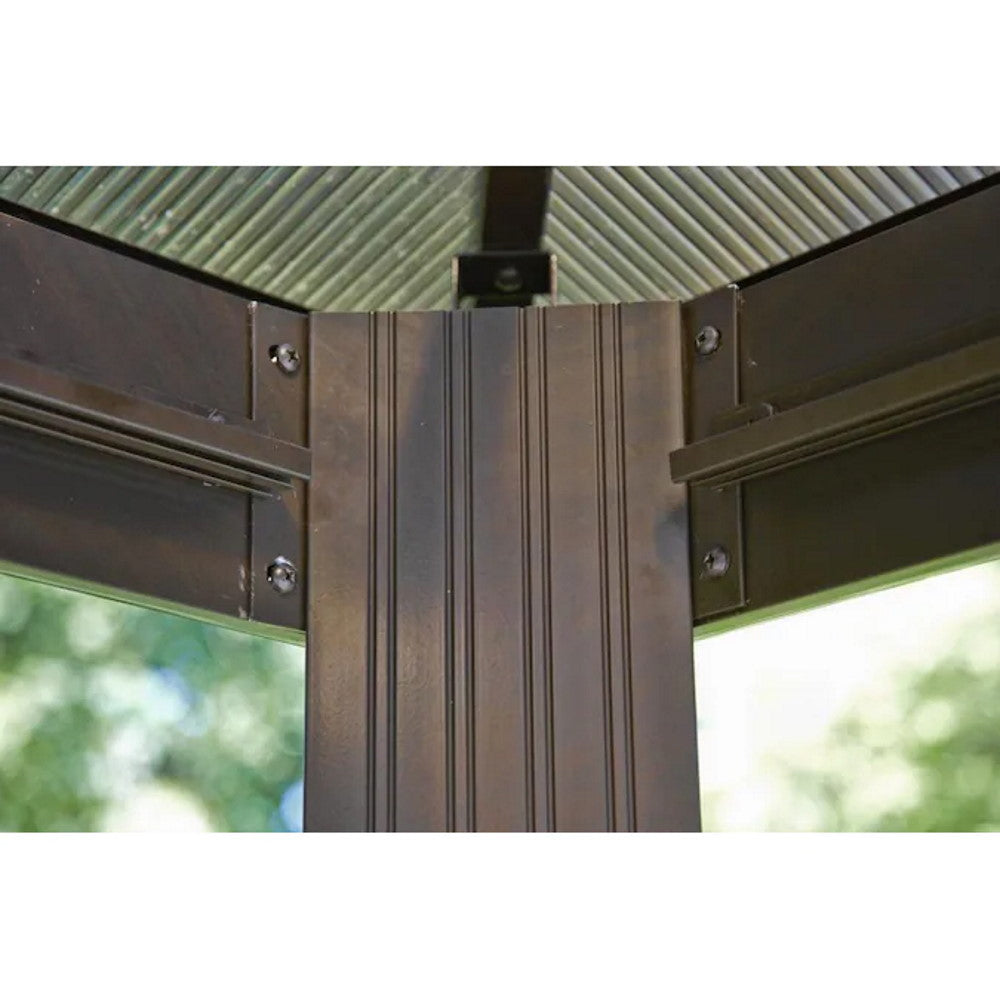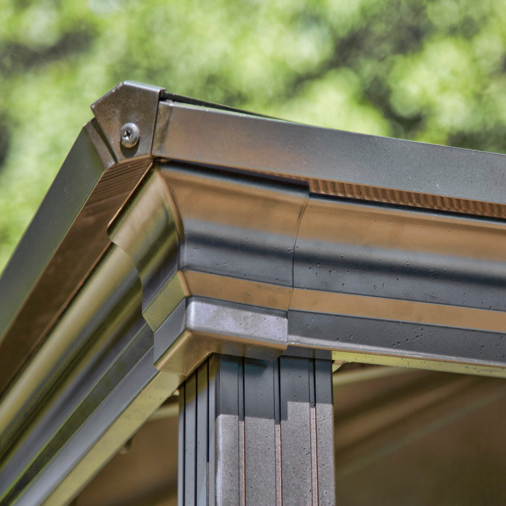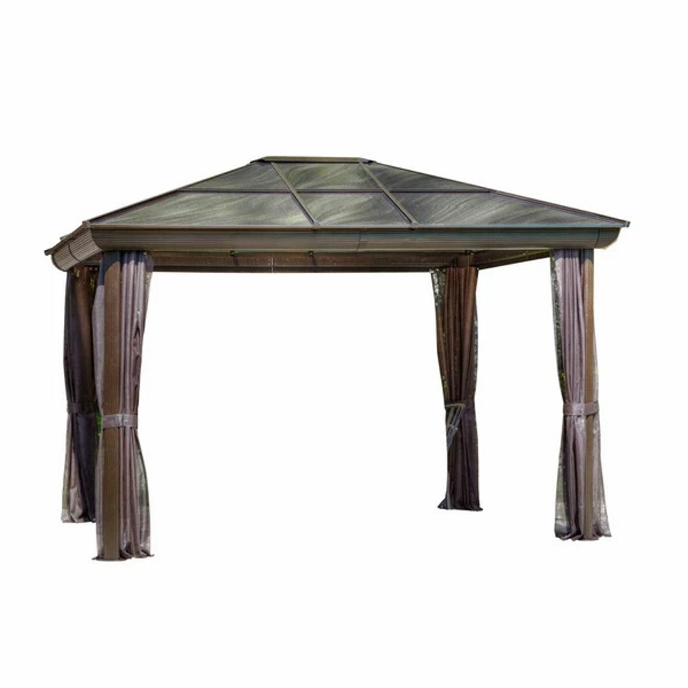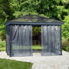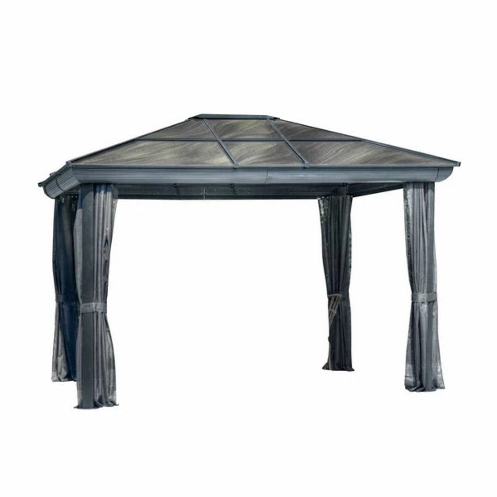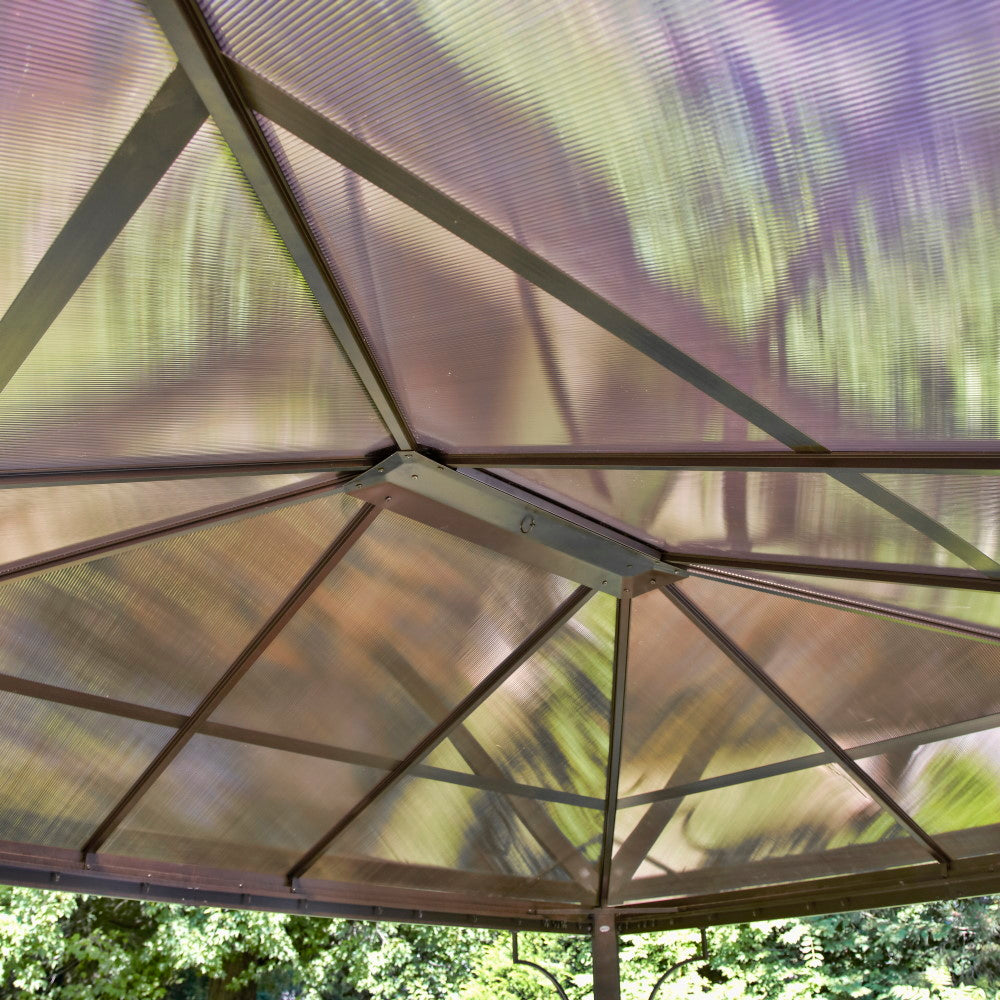 Relax in the shade under this Venus gazebo, and when the bugs start biting, use the screening to keep them out. This gazebo is made of extruded aluminum and features a roof made of a reinforced polycarbonate, which can be left up year-round saving yourself the trouble of assembling and disassembling at the end of the season.
