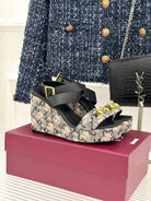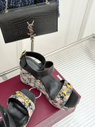 GC Floral Platform Wedge Sandal Black Mix Flower lambskin