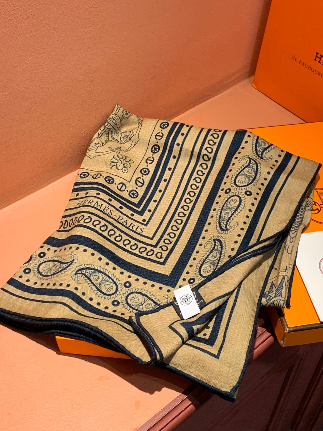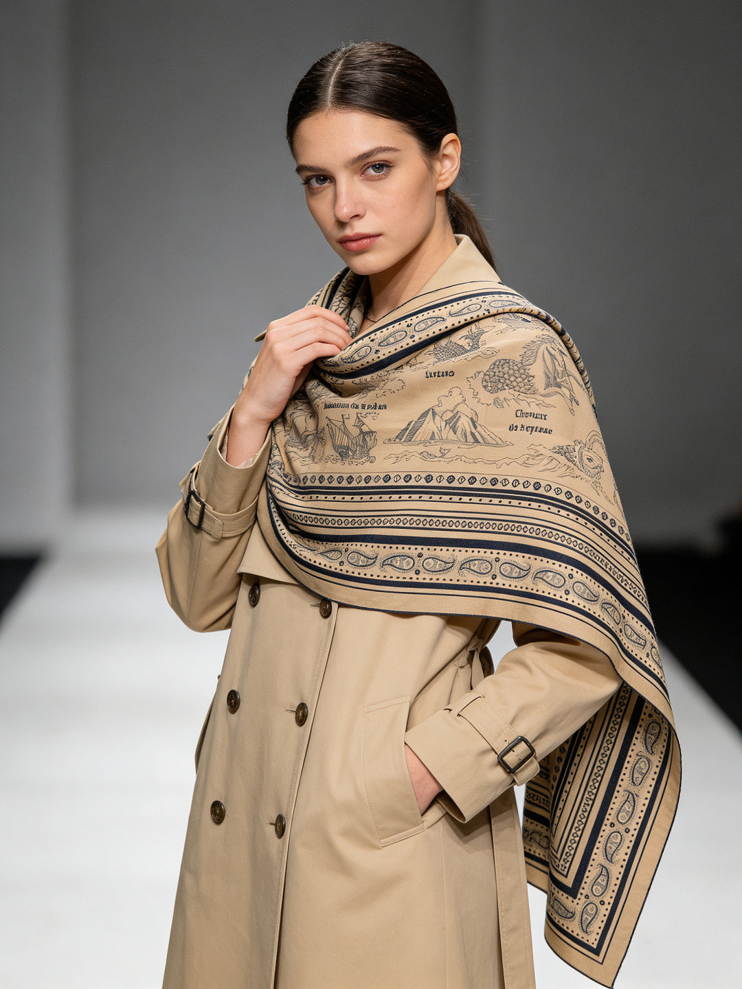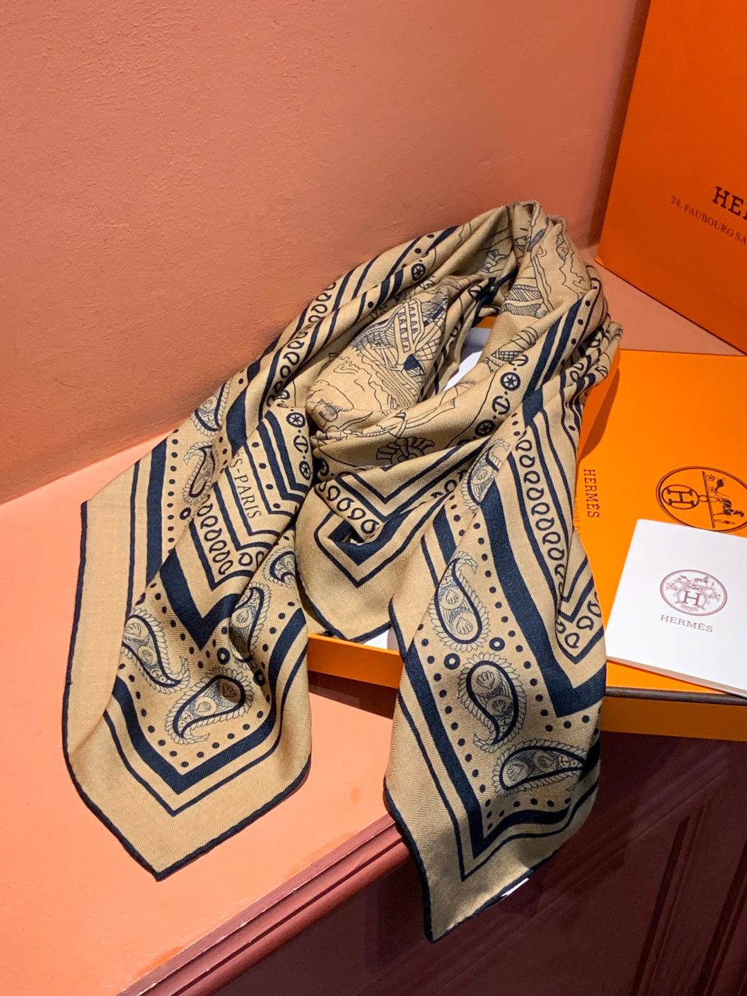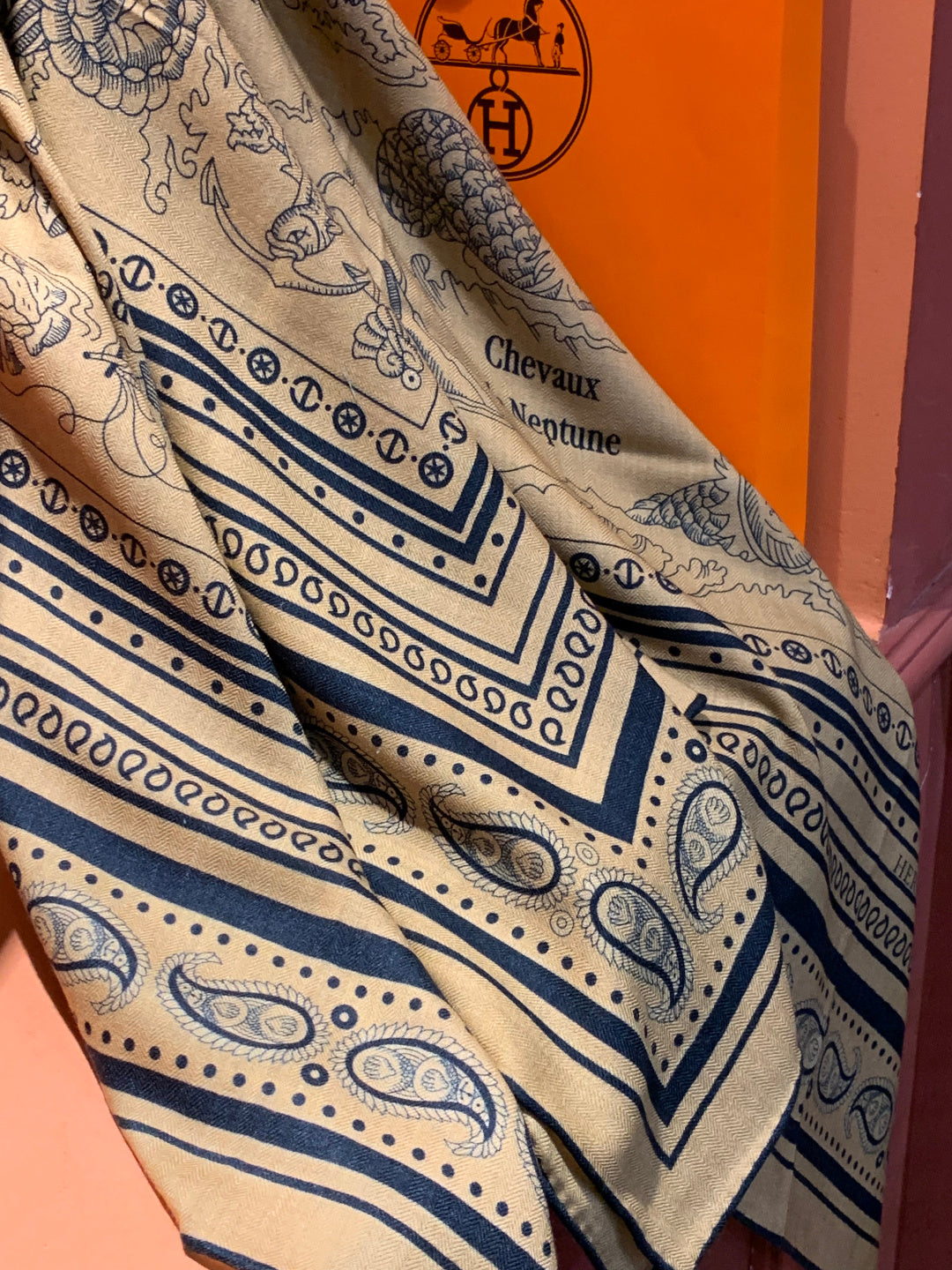 HM 25s Sailor Tattoo Scarf 140cm Dark Beige Black Cashmere Silk 967416