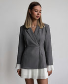 Ein eleganter Mix aus Raffinesse und moderner Mode. Das Blazer-Kleid vereint eine strukturierte Silhouette mit einer fließenden, plissierten Rockpartie und sorgt so für einen einzigartigen Look, der sich sowohl für geschäftliche Anlässe als auch stilvolle Events eignet.